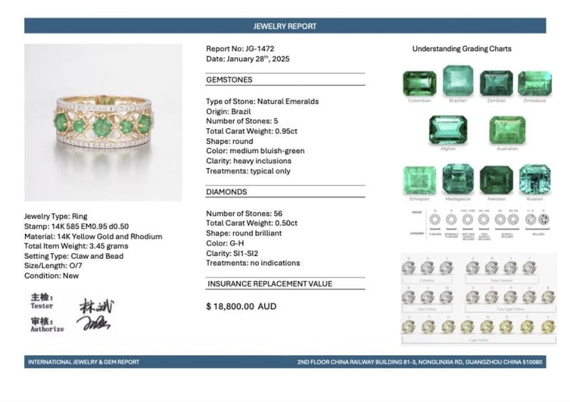 14CT YELLOW GOLD BRAZILIAN EMERALD AND DIAMOND DRESS RING Featuring Centre, 5 Round Cut, Medium Bluish-Green Brazilian Emeralds (0.95Ct Tsw, Heavy Inclusions), Claw Set, With 56 Round Brilliant Cut Diamonds (0.50Ct Tdw, G-H Colour, Si1-Si2 Clarity), Bead Set In White Gold. Ring Size O. Valuations Provided by an Independent Third-Party Professional Not Directly Associated With Lloyds Auctions at AUD $18800This valuation has been conducted by an independent third-party professional. The valuation amount is an assessment by the issuing valuer and does not reflect the auction value of the item. Any inquiries regarding the valuation should be directed to the issuing valuer (refer to contact details on the certificate), as Lloyds Auctions has no affiliation or influence over the valuation, the valuer, or the stated amount. Condition: Good - Refer Images 0584587+2254