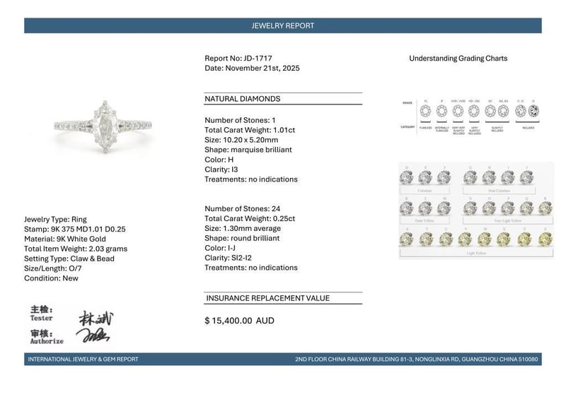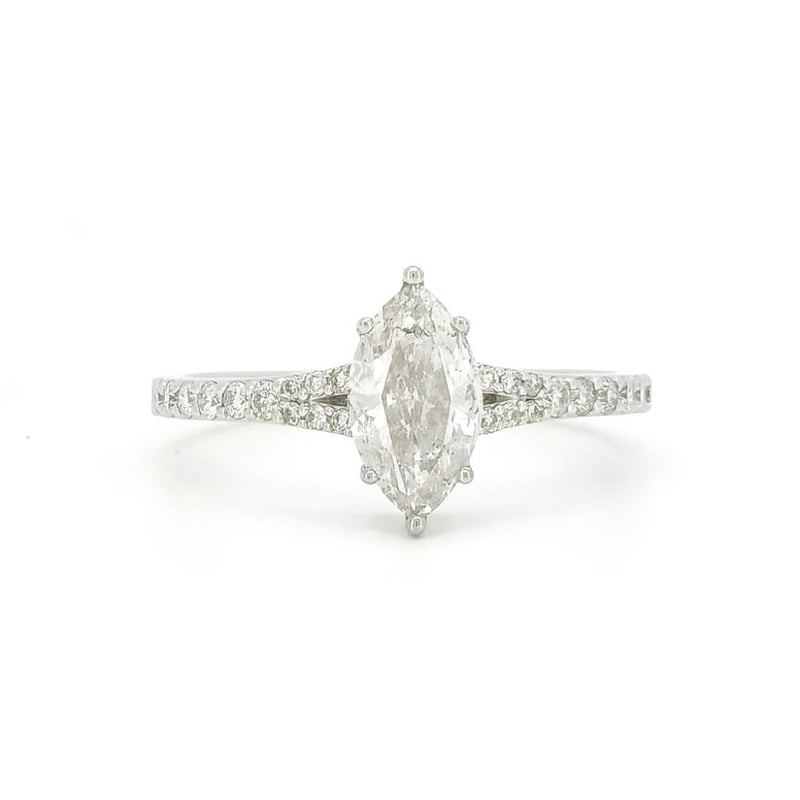 9CT WHITE GOLD DIAMOND DRESS RING Featuring Centre, One Marquise Brilliant Cut Diamond (1.01Ct, H Colour, I3 Clarity), Claw Set, With 24 Round Brilliant Cut Diamonds (0.25Ct Tdw, I-J Colour, Si2-I2 Clarity), Bead Set. Ring Size O. Valuations Provided by an Independent Third-Party Professional Not Directly Associated With Lloyds Auctions at AUD $15400This valuation has been conducted by an independent third-party professional. The valuation amount is an assessment by the issuing valuer and does not reflect the auction value of the item. Any inquiries regarding the valuation should be directed to the issuing valuer (refer to contact details on the certificate), as Lloyds Auctions has no affiliation or influence over the valuation, the valuer, or the stated amount. Condition: Good - Refer Images 0584587+2252