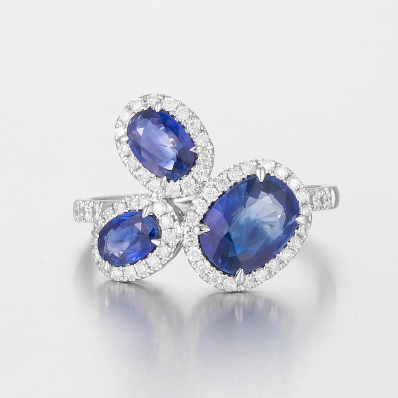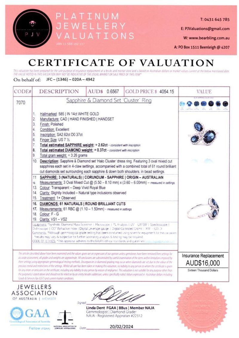 14CT WHITE GOLD AUSTRALIAN SAPPHIRE AND DIAMOND CLUSTER RING Featuring Centre, 3 Oval Cut, Deep Vivid Royal Blue Australian Sapphires (2.62Ct Tsw, Slightly Included), Claw Set, With 61 Round Brilliant Cut Diamonds (0.37Ct Tdw, F-G Colour, Vs1-Vs2 Clarity), Bead Set. Ring Size O. Valuations Provided by an Independent Third-Party Professional Not Directly Associated With Lloyds Auctions at AUD $16000This valuation has been conducted by an independent third-party professional. The valuation amount is an assessment by the issuing valuer and does not reflect the auction value of the item. Any inquiries regarding the valuation should be directed to the issuing valuer (refer to contact details on the certificate), as Lloyds Auctions has no affiliation or influence over the valuation, the valuer, or the stated amount. Condition: Good - Refer Images 0584587+2253
