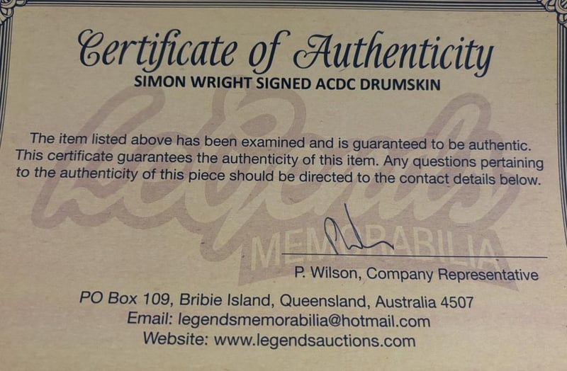 ACDC DRUMSKIN SIGNED BY SIMON WRIGHTAcdc 12 Inch Drumskin Personally Signed By Drummer Simon Wright. The Item Is Accompanied By A Certificate Of Authenticity. Condition: Good - Refer To Images584560+30
