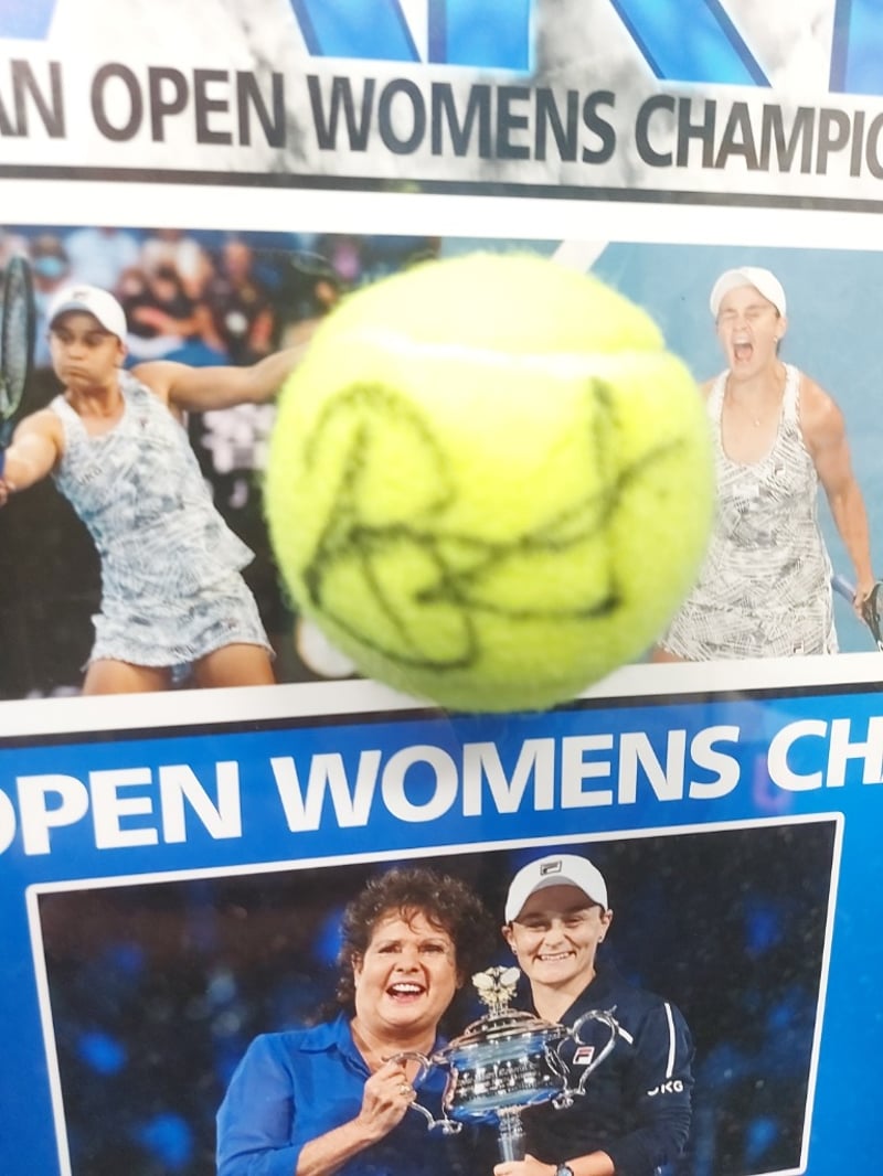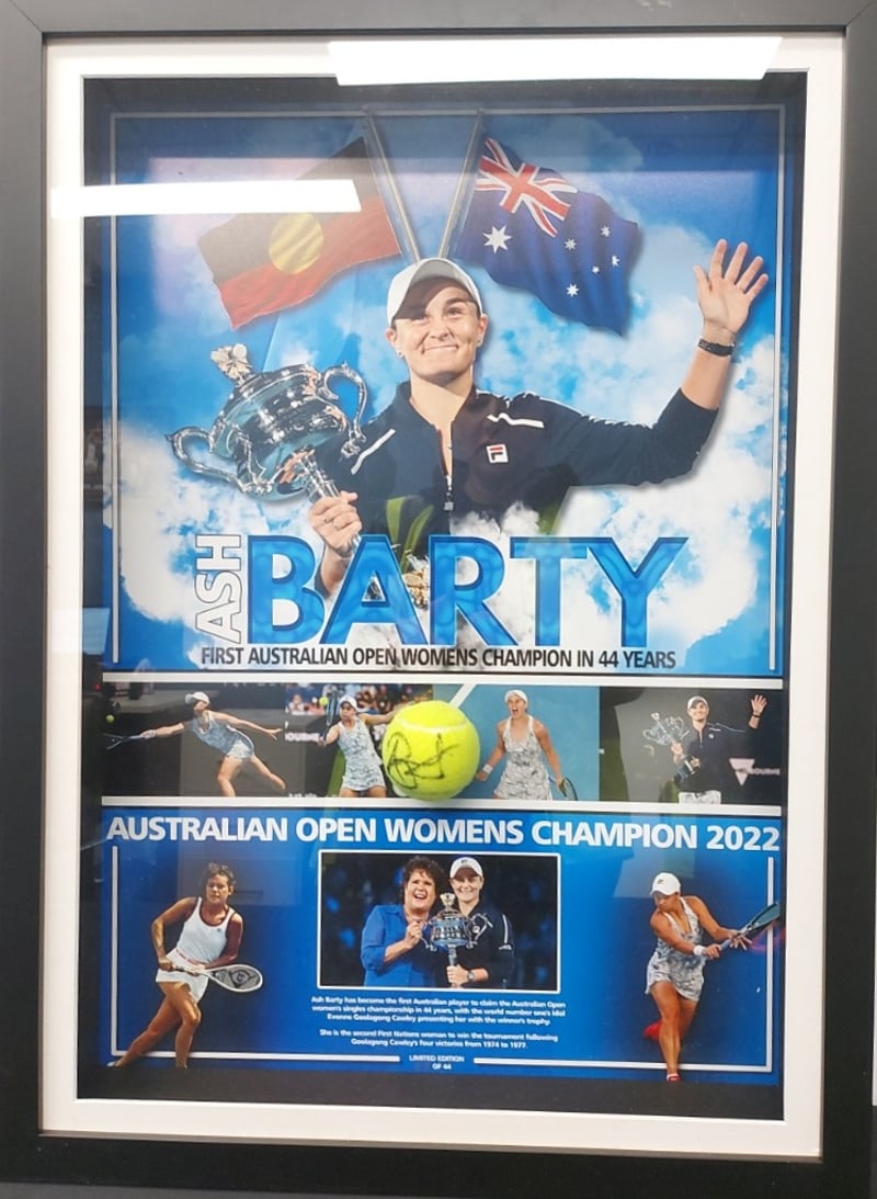 ASH BARTY PICTURE FRAMED SIGNED BY ASH BARTY'S VICTORY AS THE 2022 AUSTRALIAN OPEN WOMEN'S SINGLES CHAMPION, PERSONALLY SIGNED TENNIS BALLItem Size: Height: 76cm, Width: 56cm, Depth: 8cm488526+246