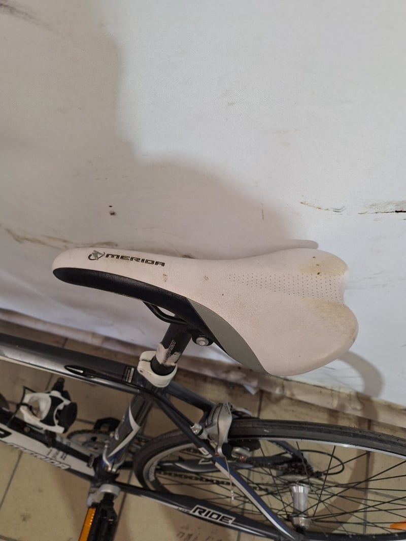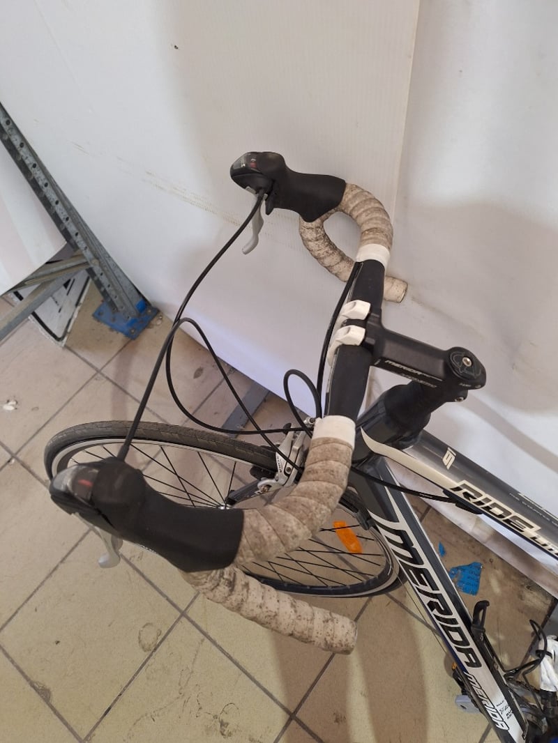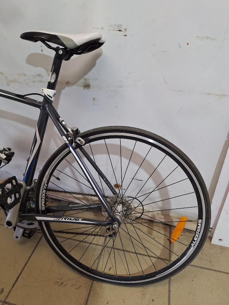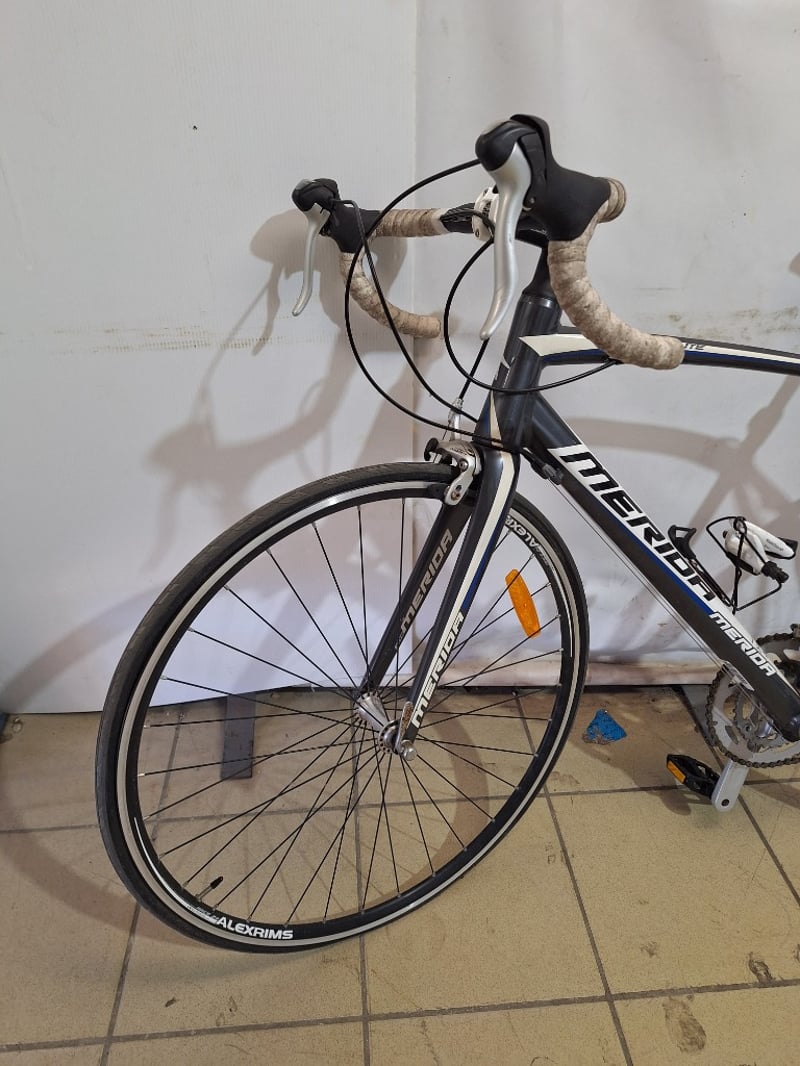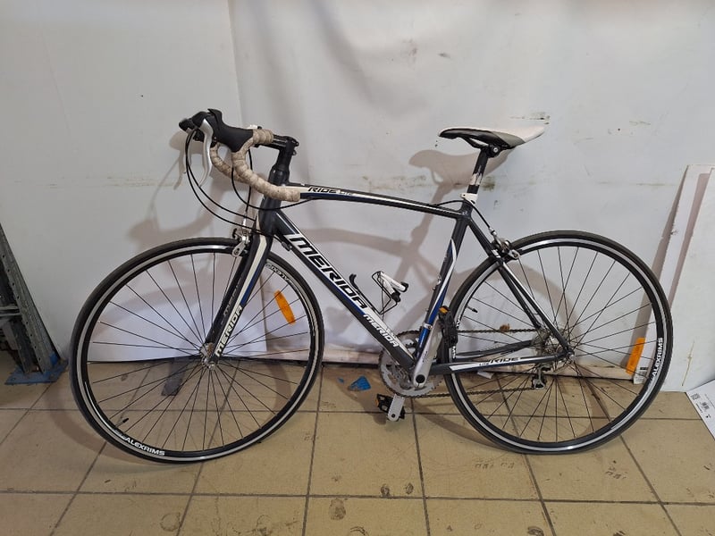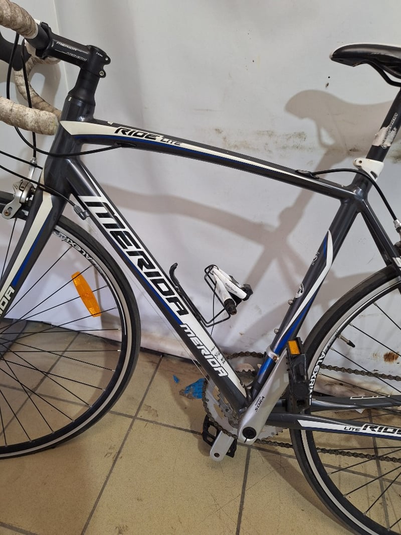 Merida Ride Lite road bike featuring a black frame with blue accents and white detailing.