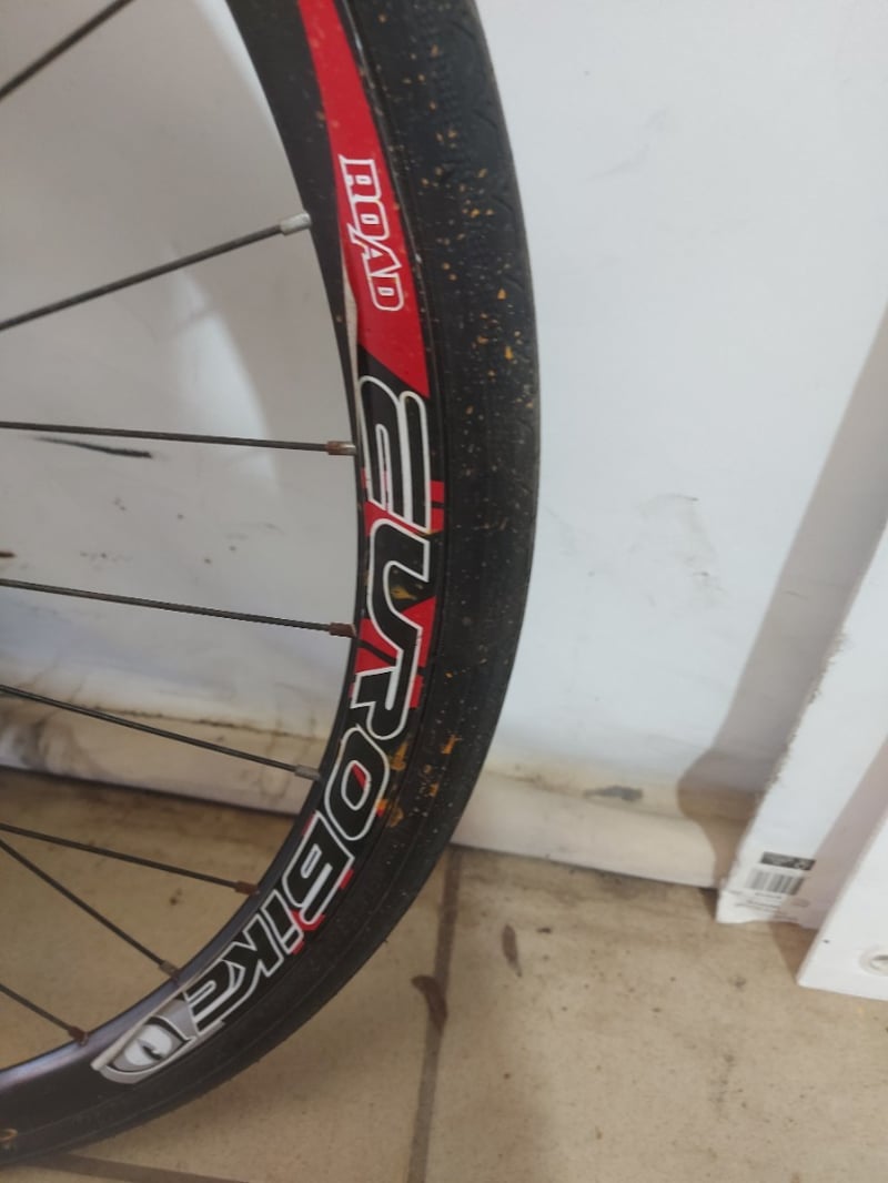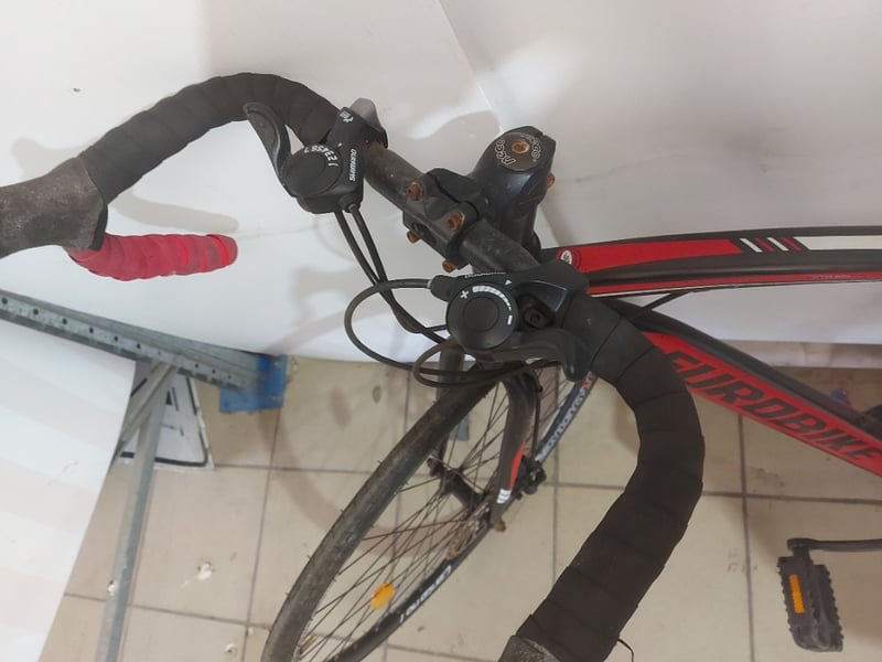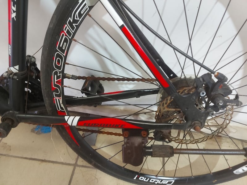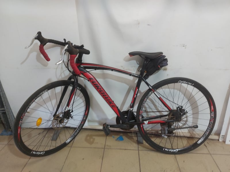 Hybrid road/gravel bike featuring a red and black Eurobike frame with disc brakes.