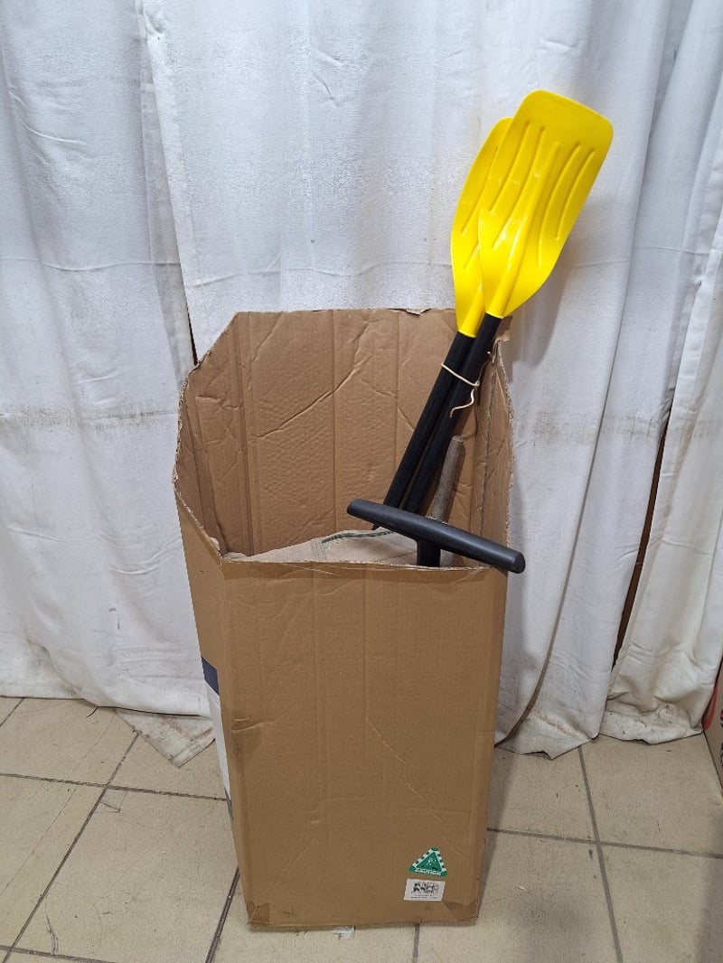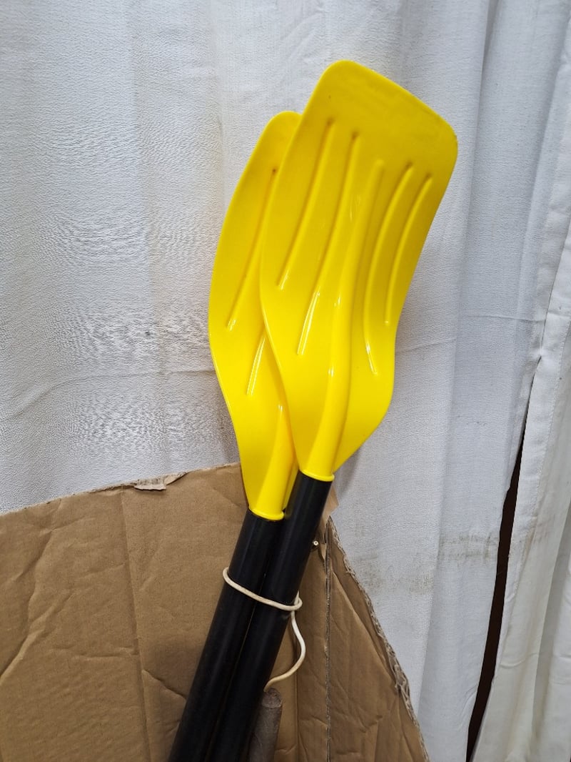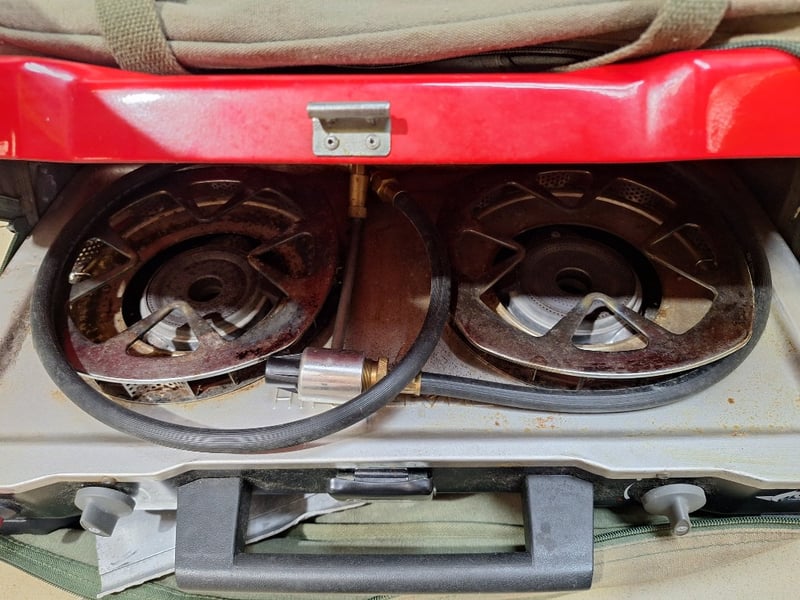 Camping/outdoor equipment bundle comprising a dual-burner portable camping stove, a hand-operated air pump, kayak/canoe paddle
