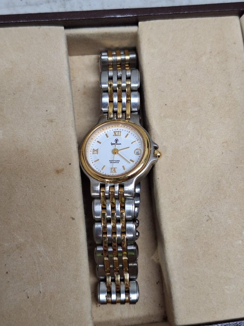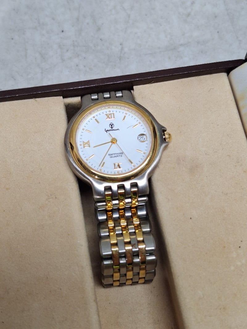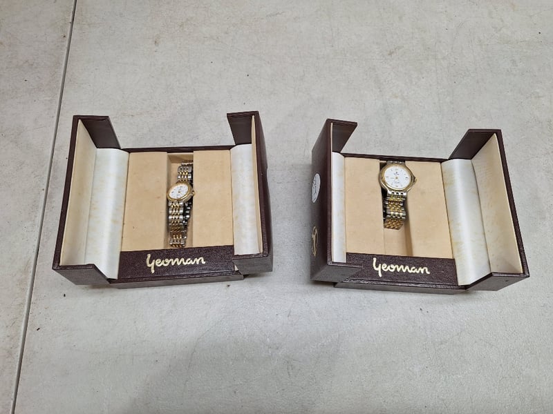 2 x YEOMAN watches, white dial with gold tone hourmarkers & roman numerals with date display, water resistant 3ATM, 2 tone bracelet with fold over snap lock closure, Swiss made, NEW in boxes