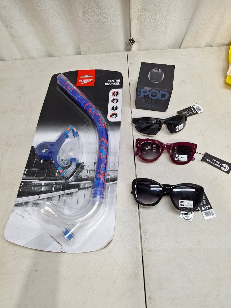 FCS POD, powered by shark banz, active shark deterrent, reduce the risk of sharks, in box, SPEEDO head mounted centre snorkel with purge valve, factory sealed in box, 3x assorted sunglasses, NEW with tags