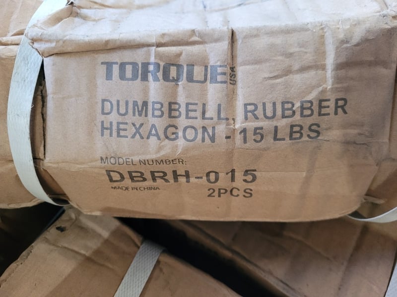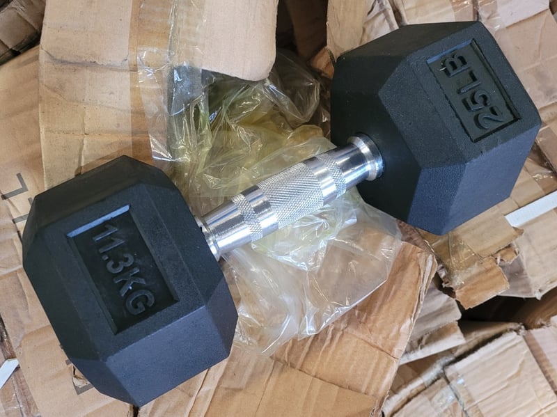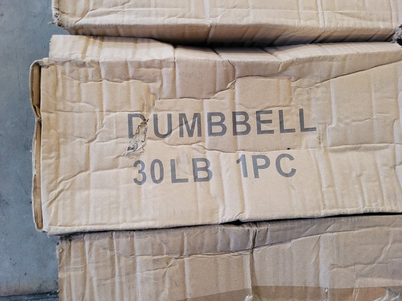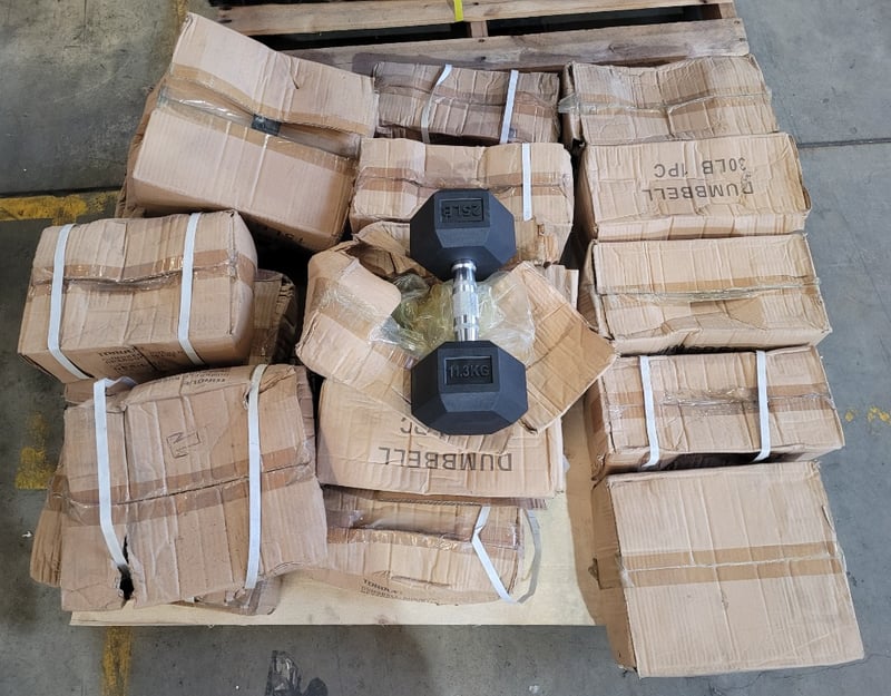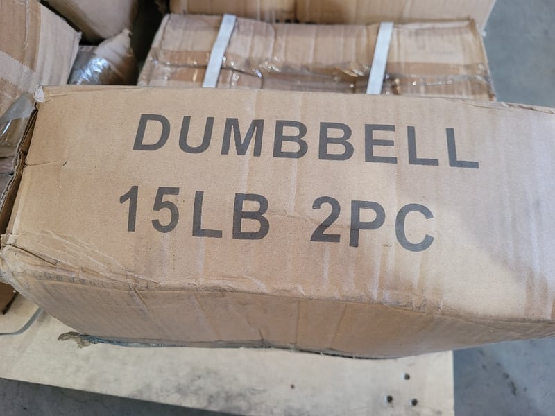 Pallet Lot of Dumbbells Description: Pallet of exercise dumbbells sold as lot, quantity to pallet, mixed weights, rubber, new in box.