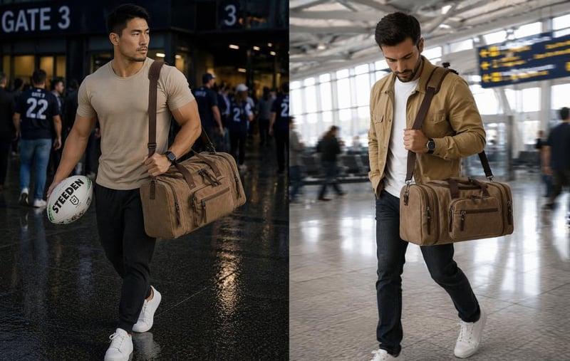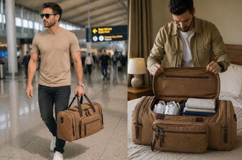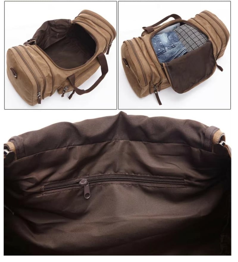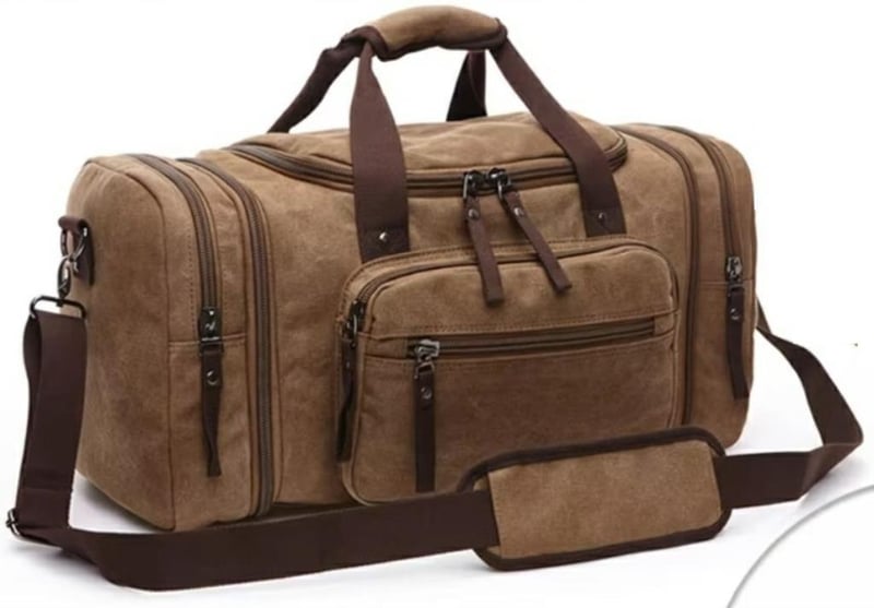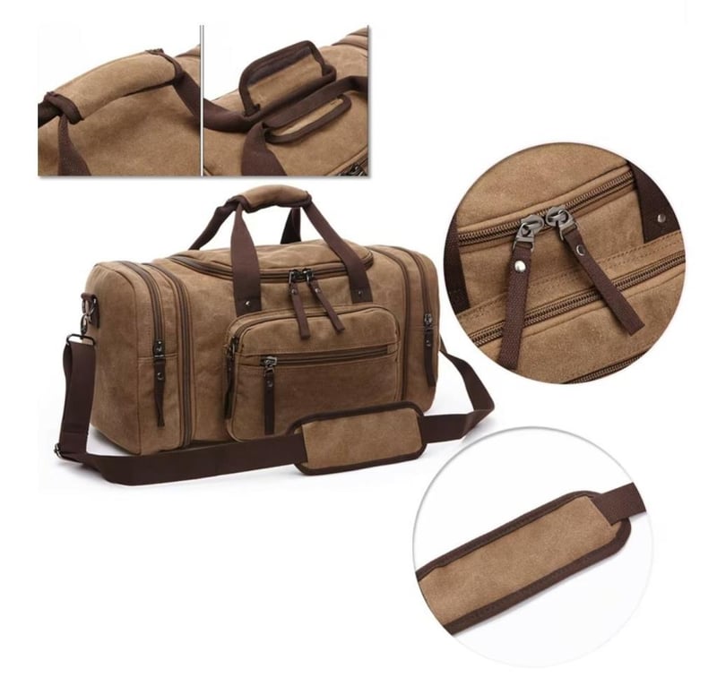 Duffel Bag 55cm x 30cm x 25cm (2.8 INCH EXTENDABLE SIDE ZIPPERS) Water Resistant Lightweight Carry-on Weekender Travel Gym Overnight Tote Bag Shoulder strap Strong Canvas/polyester-cotton lining Multiple inside Pockets Double Zipper Top Flap. (Sometimes in the creation of images and videos there may be very small differences in the product itself or size comparison, so these images are used only for the visual effect of the product shown, however the exact product with its specifications and size is always shown in the later/earlier photos so please be aware of this.) (BRAND NEW IN PLASTIC) COFFEE COLOUR