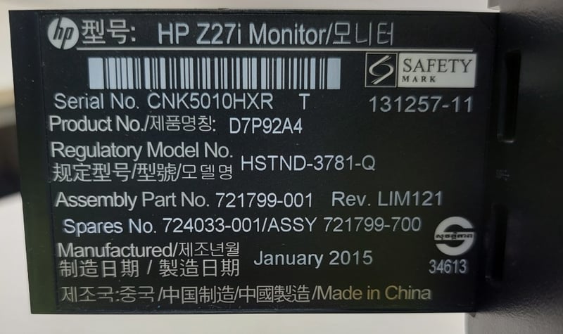 Monitor - HP Z Display Z27i, 27" IPS LED backlit, DOM: 01/15, S/N:CNK5010HXR