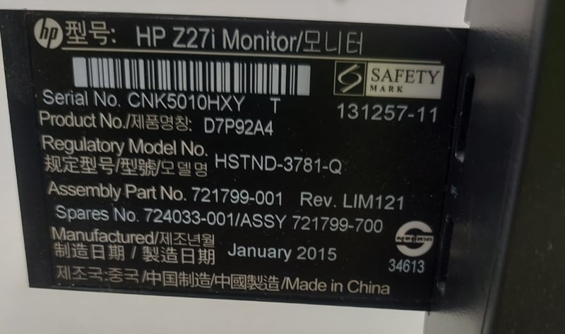 Monitor - HP Z Display Z27i, 27" IPS LED backlit, DOM: 01/15, S/N:CNK5010HXY Note: item is untested, signs of wear.