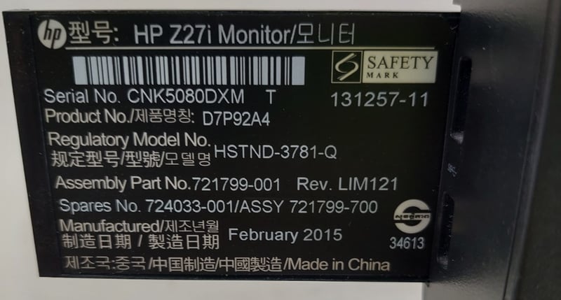Monitor - HP Z Display Z27i, 27" IPS LED backlit, DOM: 02/15, S/N:CNK5080DXM Note: item is untested, signs of wear.No power cables included.