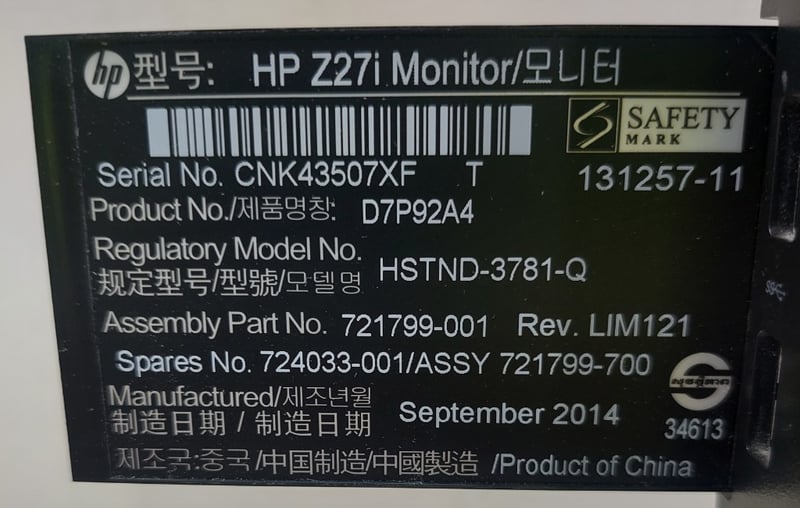 Monitor - HP Z Display Z27i, 27" IPS LED backlit, DOM: 09/14, S/N:CNK43507XF Note: item is untested, signs of wear.No power cables included.