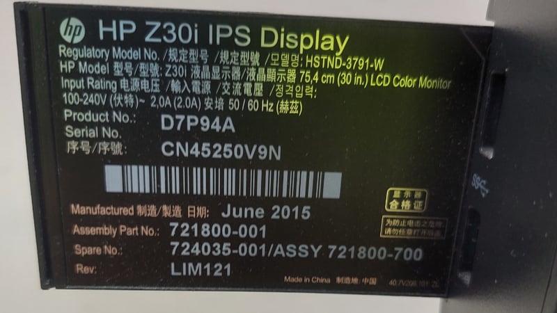 Monitor - HP Z Display Z30i, 30" IPS LED backlit, DOM: 06/15, S/N:CN45250V9NNote: item is untested, signs of wear.