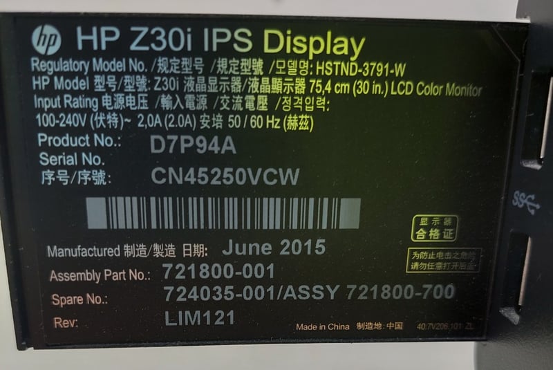 Monitor - HP Z Display Z30i, 30" IPS LED backlit, DOM: 06/15, S/N:CN45250VCW