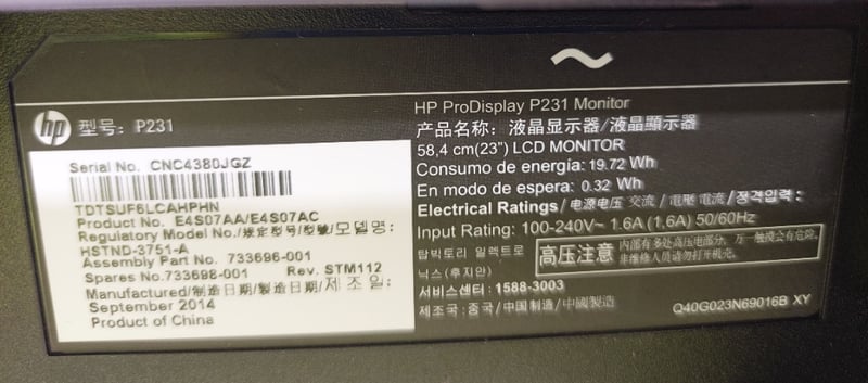 Monitor - HP ProDisplay P231, 23", DOM: 2014, S/N: CNC4380JGZ