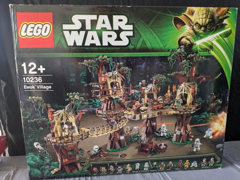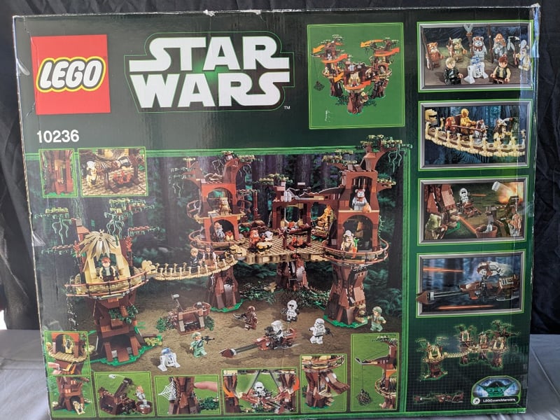 Vintage Lego Star Wars Set 10236 Ewok Village Featuring Intricate Forest Dwelling Architecture With Multiple Interconnected Tree Structures, Platforms, And Defensive Fortifications. Includes Extensive Minifigure Collection Representing Ewoks, Stormtroopers, And Other Star Wars Characters. Set Displays Detailed Landscaping With Vegetation Elements And Authentic Scene Recreation From Return Of The Jedi.