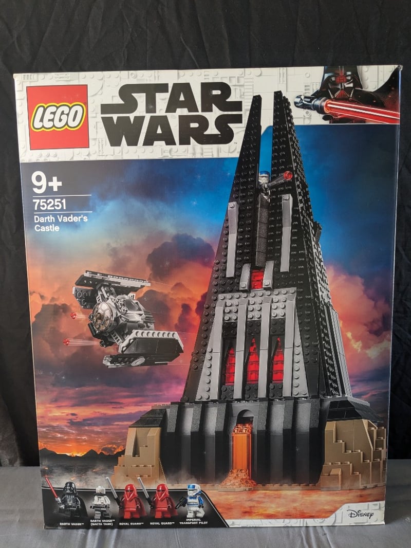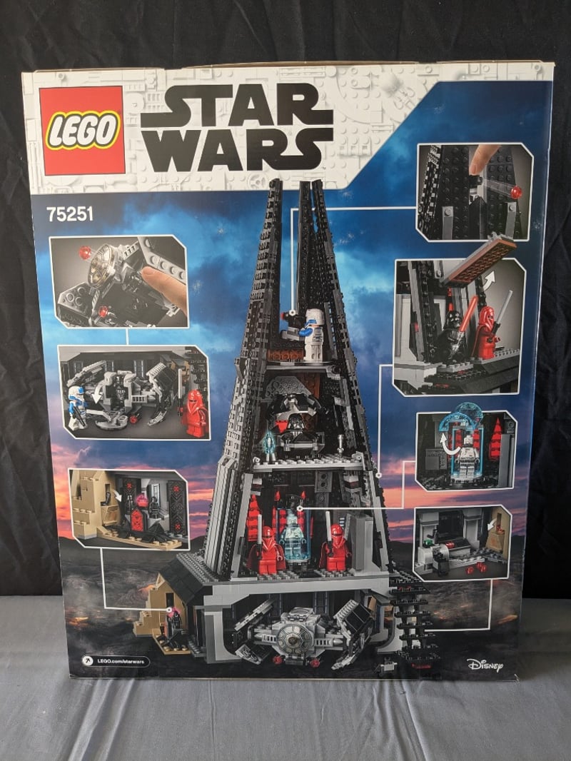 Lego Star Wars Set 75251 Featuring Darth Vader'S Castle, A Substantial Architectural Build With Multiple Interior Chambers, Minifigures Including Darth Vader Variants And Imperial Royal Guard, Tie Advanced Starfighter, And Detailed Room Configurations. Includes Instruction Manual And Original Packaging With Comprehensive Imagery Of Set Features And Playable Elements.