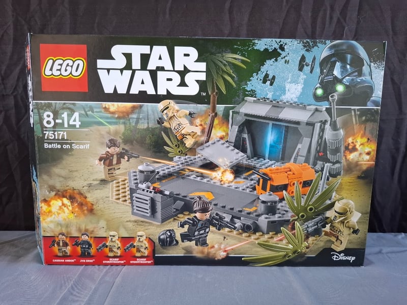 Lego Star Wars Set 75171 "Battle On Scarif" Featuring A Detailed Imperial Base With Blue-Door Entrance, Orange At-St Walker, Landing Platform With Firing Elements, And Four Minifigures Including Cassian Andor, Jyn Erso, Scarif Stormtrooper Variants. Includes Tropical Vegetation Elements And Multiple Weapon Accessories. Age Range 8-14 Years.