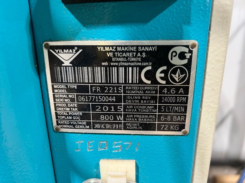 Yilmaz FR 221S Copy Router – 240V Single Phase Technical Specifications: Model: FR 221S Production Date: 2015 Voltage: 240V AC 50Hz (Single Phase) Motor Power: 800 W Spindle Speed: 14,000 RPM (High-speed for clean aluminum routing) Air Pressure Required: 6–8 Bar Air Consumption: 5 L/min Weight: 72 kg (Excluding roller stand) Condition: Excellent working condition for its age. Data plate is clearly legible and serial number is intact (06177150044). Sold as is Location: #MACKAY Contact Kyle Haywood | Ph 0487 020 888 | [email protected]