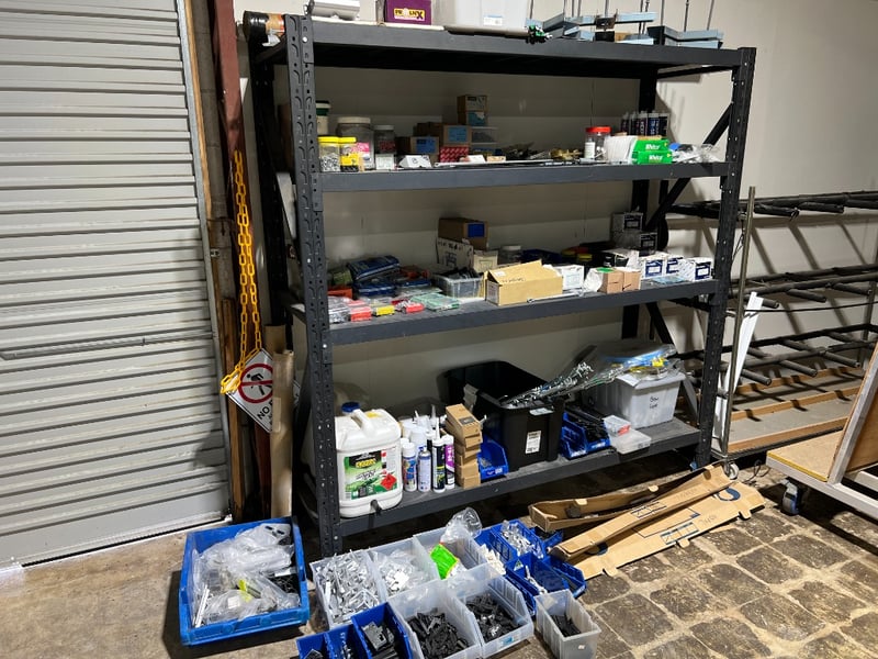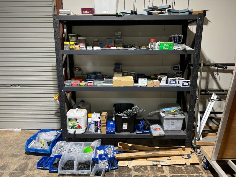 A comprehensive workshop storage lot comprising a heavy-duty 4-tier steel shelving unit stocked with a significant quantity of professional window and door fabrication components. This lot is ideal for an established fabricator looking to bolster stock or a new business starting up.