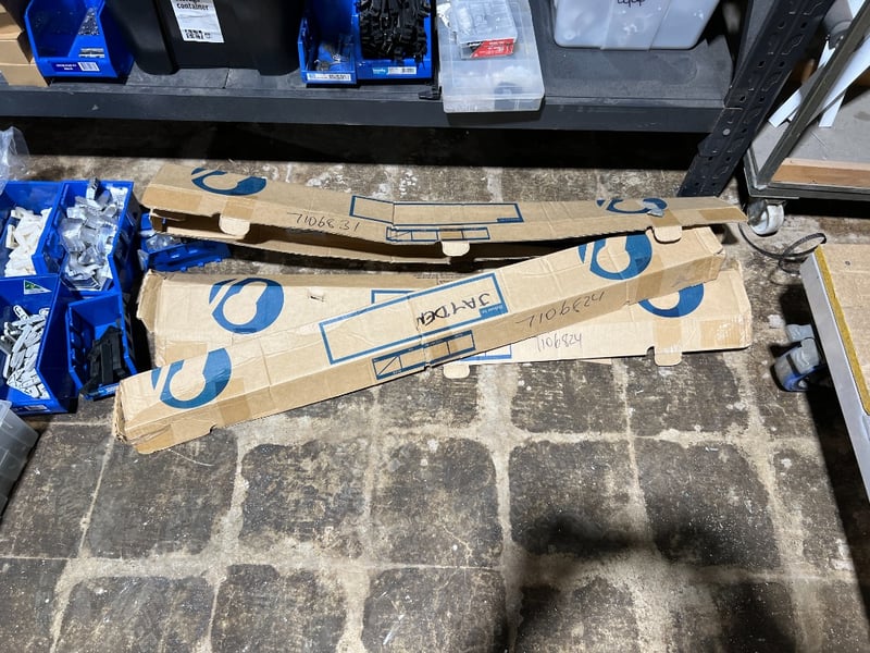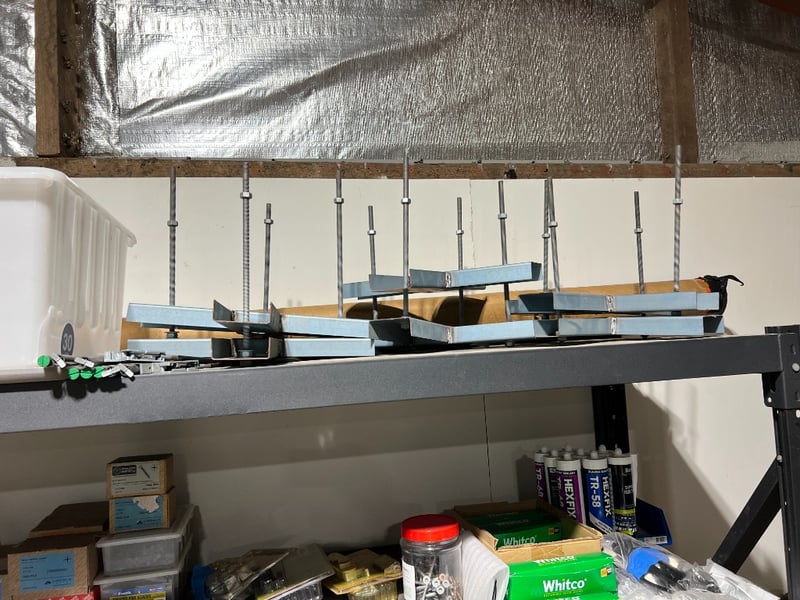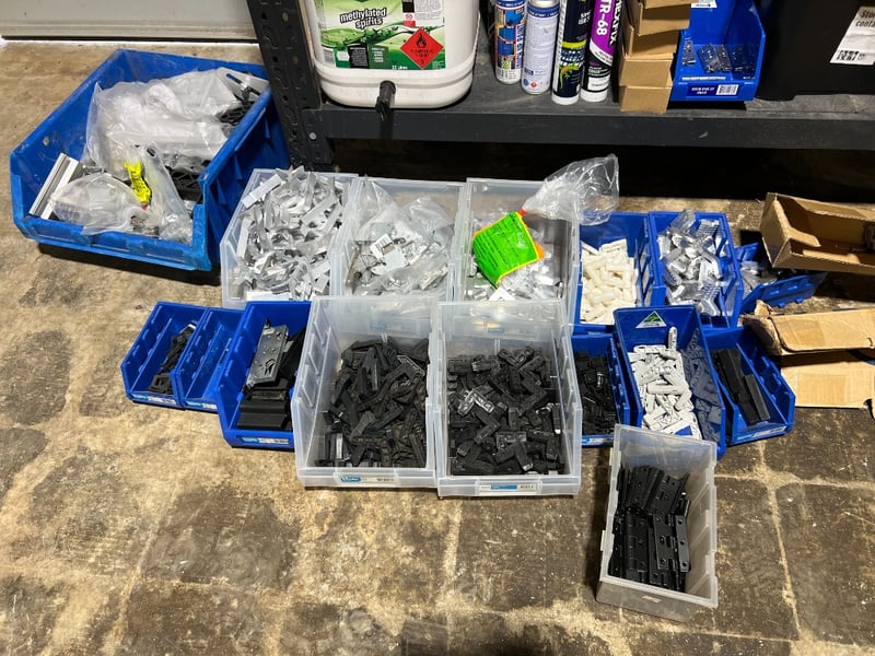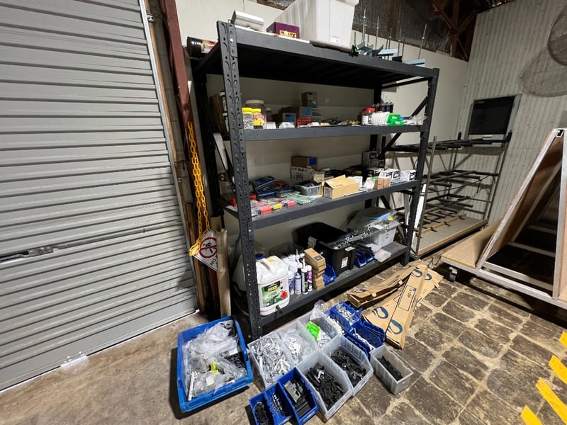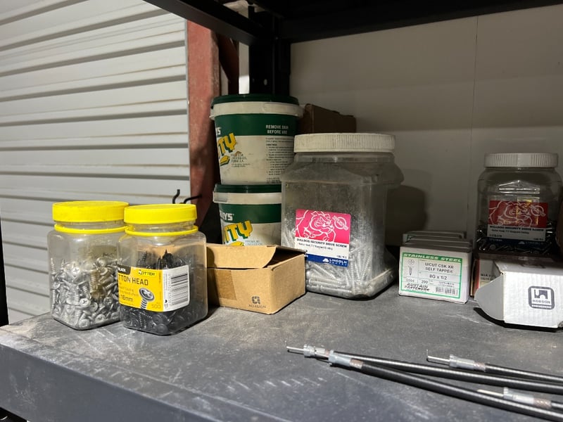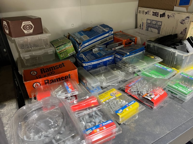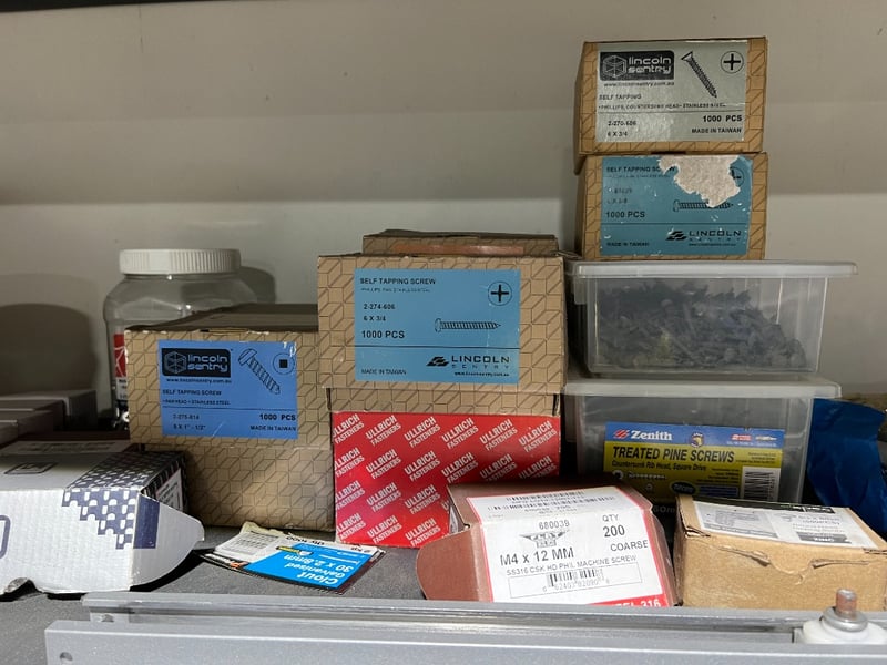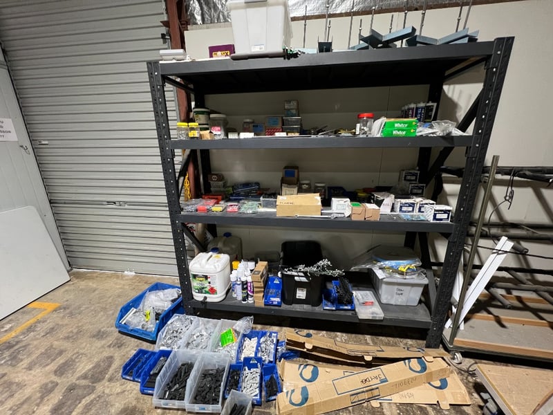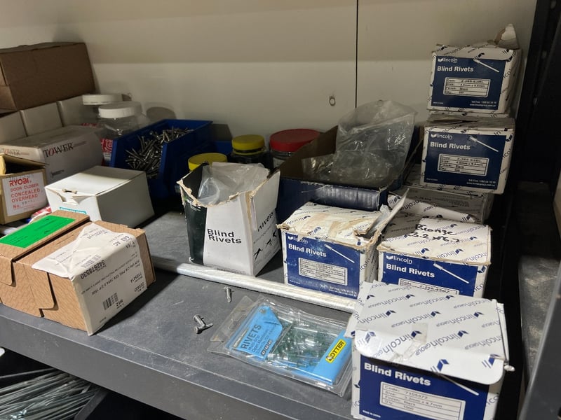 Fabrication Consumables: Large quantities of structural fasteners, screws, and rivets organized in various bins.