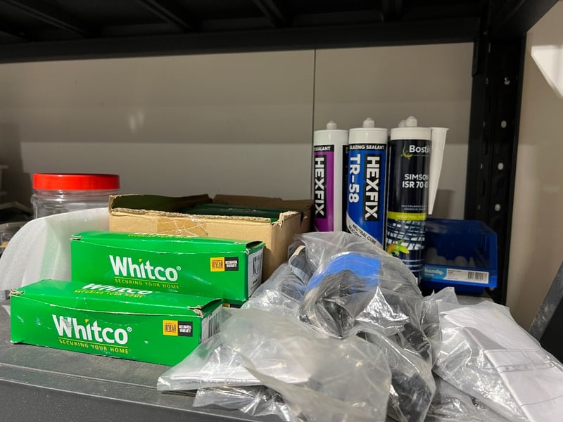Premium Brand Hardware: Significant stock of Whitco window catches, locks, and accessories (visible in original packaging).