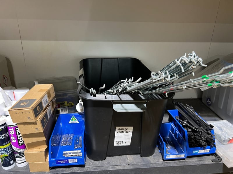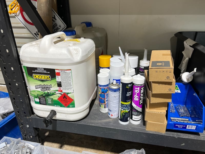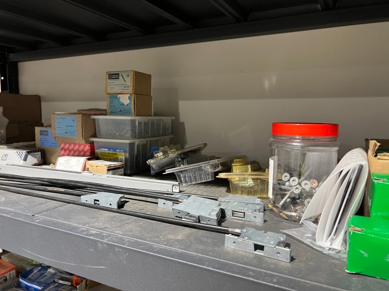 The shelves and floor space contain an extensive range of Australian-standard window and door consumables, including: