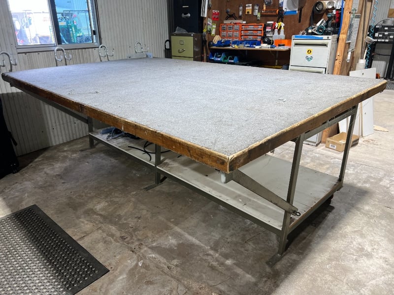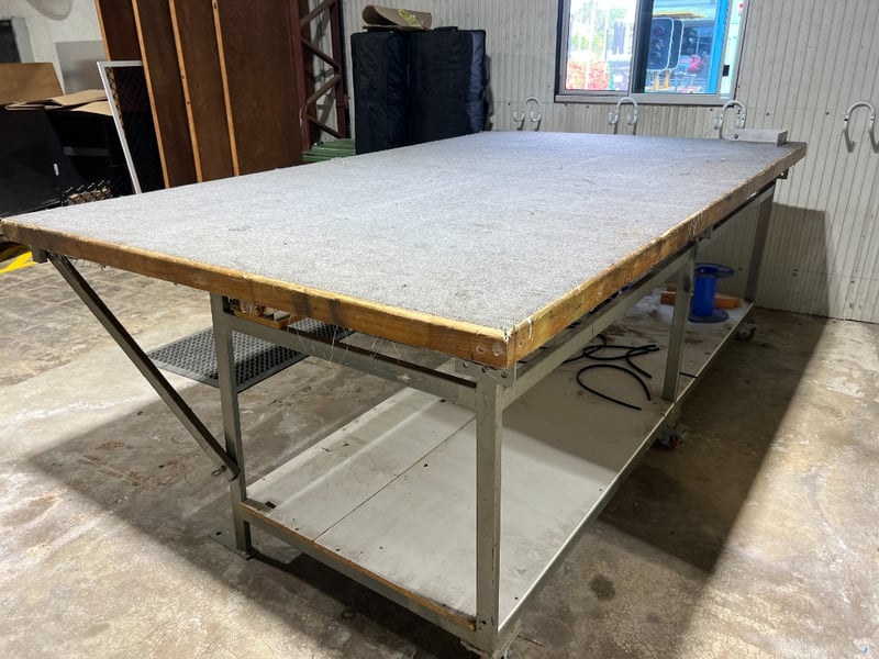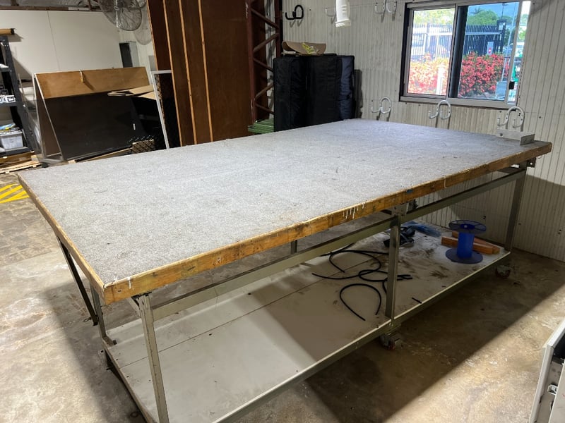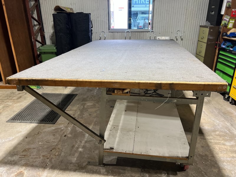 This is a custom-fabricated asset built for durability. The carpeted surface is essential for anyone working with powder-coated aluminium or glass. The table shows typical signs of workshop use but remains structurally sound and highly functional.
