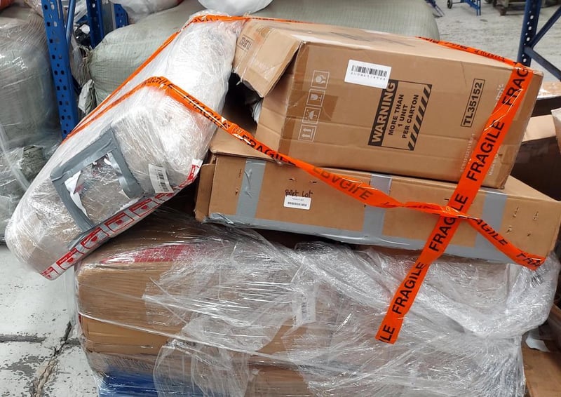 Assorted pallet of mixed goods.Contents include cooling radiator, outdoor umbrella, flat pack furniture and more. Sold as lot