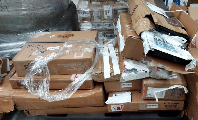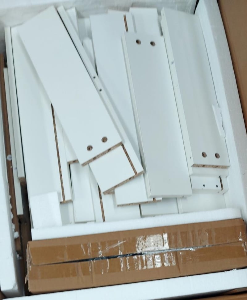 Assorted pallet of flat pack furniture. Different models, styles and colours.