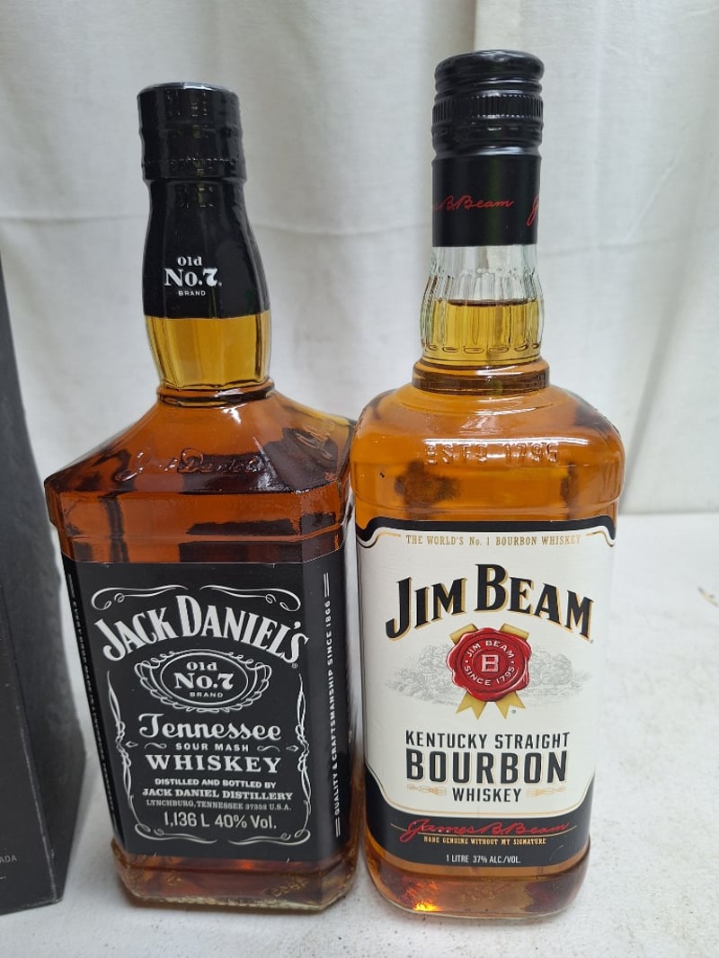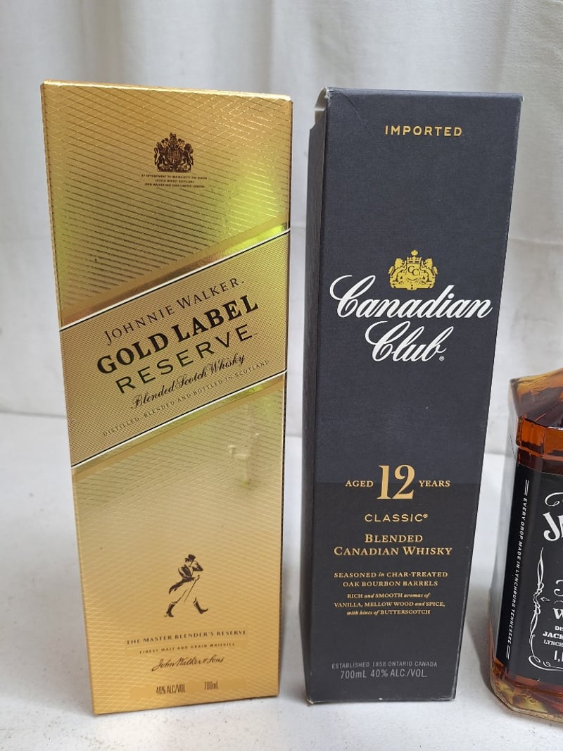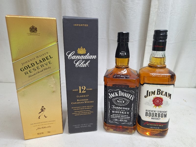 Assorted Whiskey Lot Includes Jim Beam, Jack Daniels, Canadian Club & Johnnie Walker SOLD AS LOT