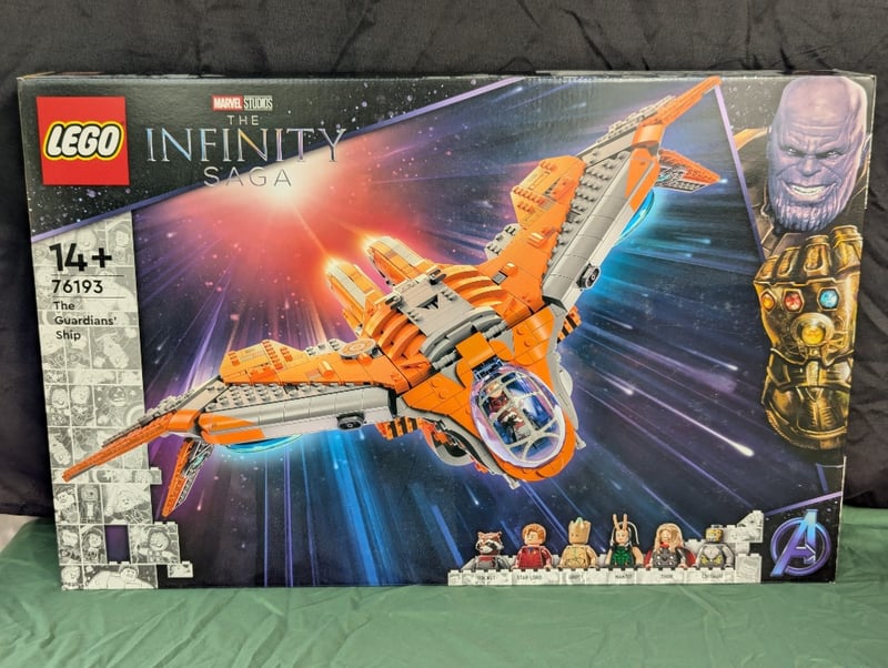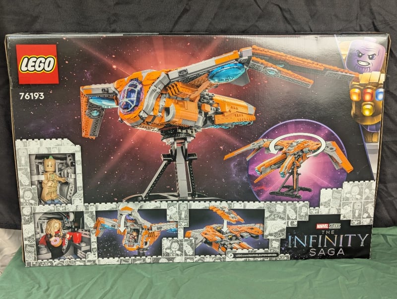 Lego Marvel Studios The Infinity Saga Set 76193 Featuring The Iconic Guardians' Ship In Orange And Grey With Detailed Cockpit, Rotating Elements, And Six Minifigures Including Thanos With Infinity Gauntlet. Age 14+. Original Packaging With Comprehensive Instruction Manual And Component Inventory Visible.