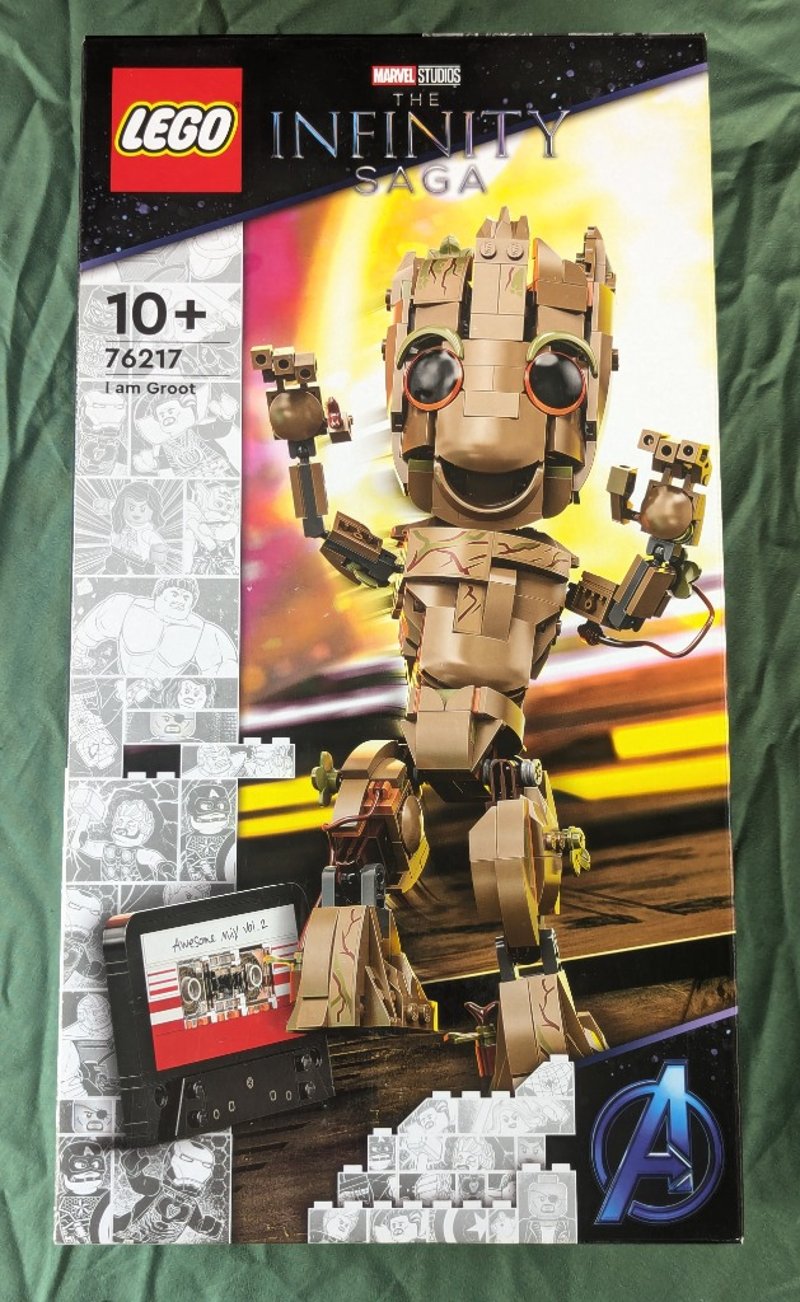 Lego Marvel Studios The Infinity Saga "I Am Groot" Buildable Figure Set 76217. Age 10+. Features Articulated Tan/Beige Construction With Detailed Facial Features, Poseable Limbs, And Accompanying Minifigure Accessories. Includes Decorative Display Stand With Cassette Tape Graphic Element. Original Packaging With Printed Instructions Visible.