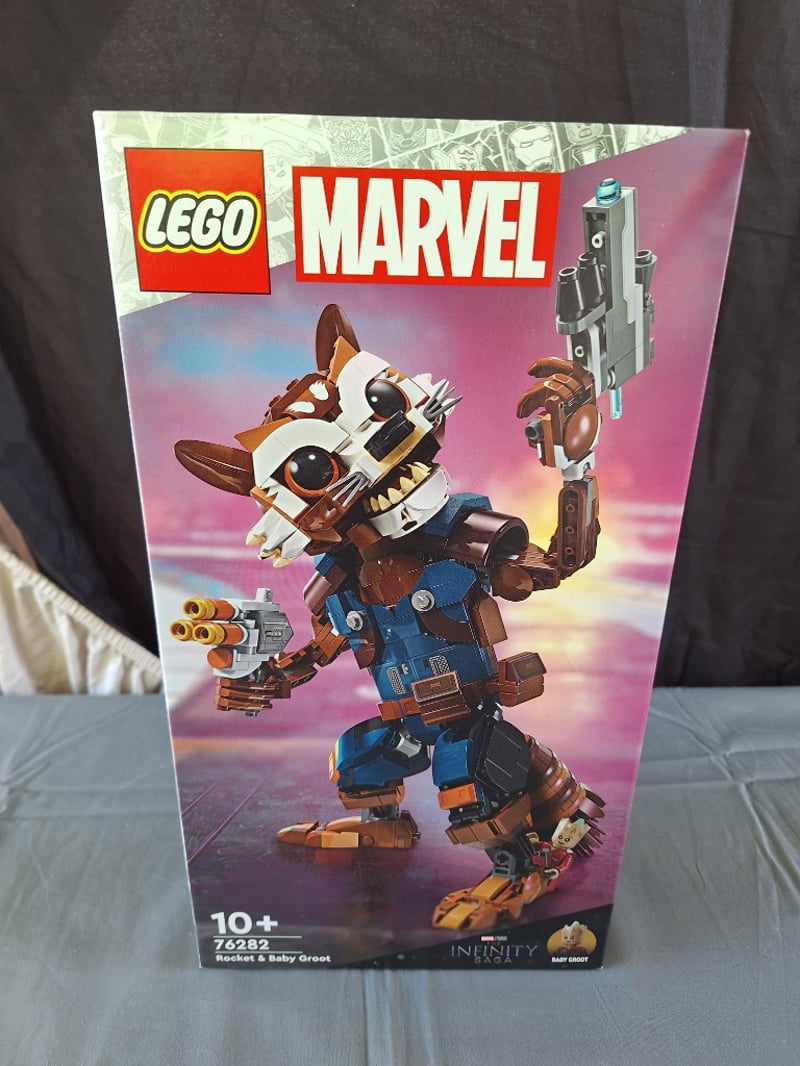 Lego Marvel Buildable Action Figure Set 76282 Featuring Rocket Raccoon And Baby Groot Characters From The Infinity Saga. Includes Articulated Minifigure With Multiple Weapons And Accessories. Age 10+. Unopened, Factory Sealed Packaging With Vibrant Artwork Displaying Both Front And Back Box Designs.