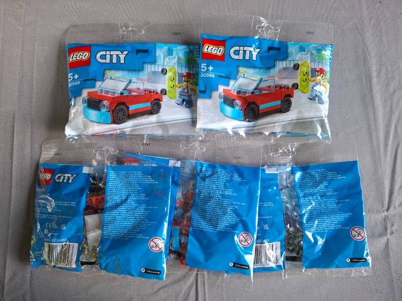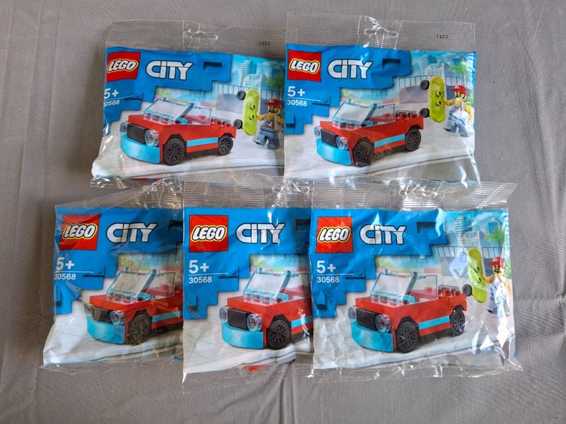 Five Sealed Lego City Polybag Sets (30568), Each Containing A Red And Blue Sports Car With Minifigure And Skateboard Accessory. Original Packaging Intact With Instruction Sheets Visible On Reverse. Age Rating 5+.