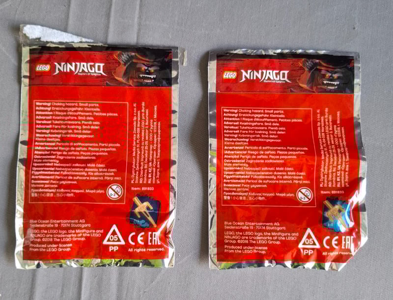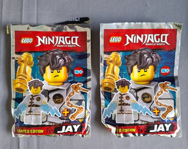 LEGO NINJAGO LIMITED EDITION JAY MINIFIGURE POLYBAGS (PAIR)Two Sealed Lego Ninjago Masters Of Spinjitzu Limited Edition Jay Minifigure Polybags Featuring White Ninja Variant With Golden Staff Accessory And Serpent Element. Original Packaging Intact With Multilingual Safety Warnings And Ce Certification Markings Visible On Reverse.Condition: Good - Refer To Images584571+848
