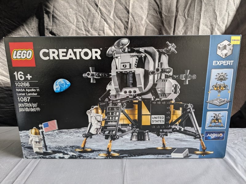 LEGO CREATOR EXPERT NASA APOLLO 11 LUNAR LANDER SET 10266Lego Creator Expert Set 10266 Featuring The Nasa Apollo 11 Lunar Lander. This Advanced 1087-Piece Construction Set Includes Detailed Lunar Module With Gold-Accented Landing Legs, Command Module With Opening Hatch, Astronaut Minifigure, American Flag, And Lunar Surface Display Base. Marked For Ages 16+. Commemorates The Apollo 50Th Anniversary Milestone. Features Authentic Nasa Branding And United States Insignia. Includes Instruction Manual And Original Packaging With Expert-Level Difficulty RatCondition: Good - Refer To Images584572+25