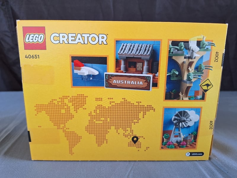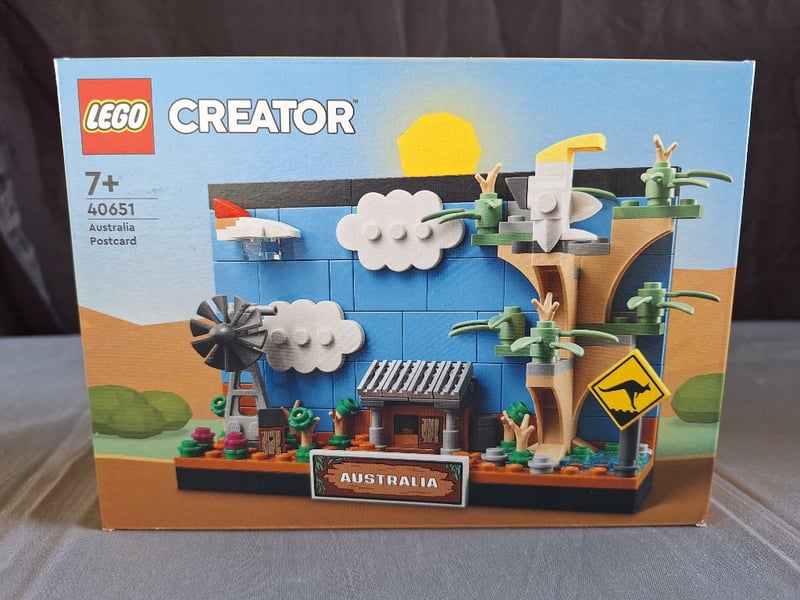 LEGO CREATOR AUSTRALIA POSTCARD SET 40651Lego Creator Australia Postcard Set 40651, Featuring Iconic Australian Landscape Elements Including Windmill, Native Vegetation, Kangaroo Warning Sign, And Colonial-Style Building With Corrugated Iron Roof. Includes Airplane And Cloud Elements Against Blue Sky Backdrop. Suitable For Ages 7+Condition: Good - Refer To Images584572+33