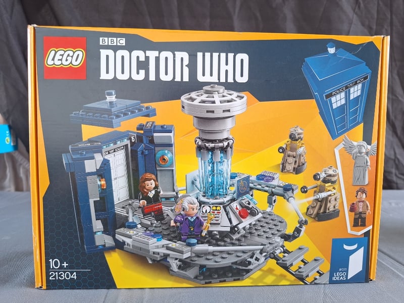 Lego Ideas Doctor Who Set 21304 Featuring The Iconic Blue Tardis Police Box With Detailed Interior Console Room, Featuring Minifigures Of The Eleventh Doctor, Twelfth Doctor, Clara Oswald, Weeping Angel, And K9 Robot Companion, Complete With Accessories And Buildable Components In Original Packaging.