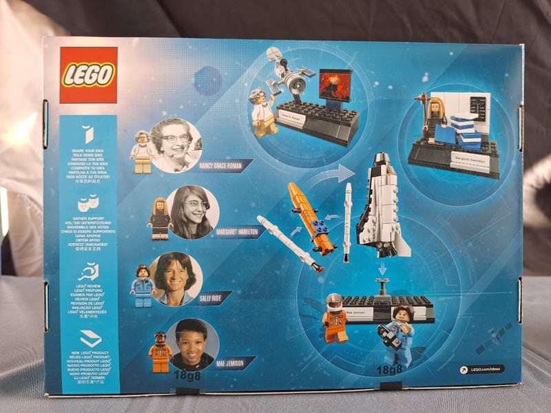 Lego Ideas Women Of Nasa Set Featuring Four Iconic Female Space Pioneers With Minifigures Representing Nancy Grace Roman (1959), Margaret Hamilton (1959), Sally Ride (1983), And Mae Jemison (1992). Set Includes Detailed Space Shuttle Model, Satellite Assembly Station, Mission Control Desk, And Commemorative Display Bases. Age Rating 10+. Complete With Original Packaging Showing All Four Vignettes And Biographical Information. Educational Stem-Focused Construction Set Celebrating Women'S Contribu