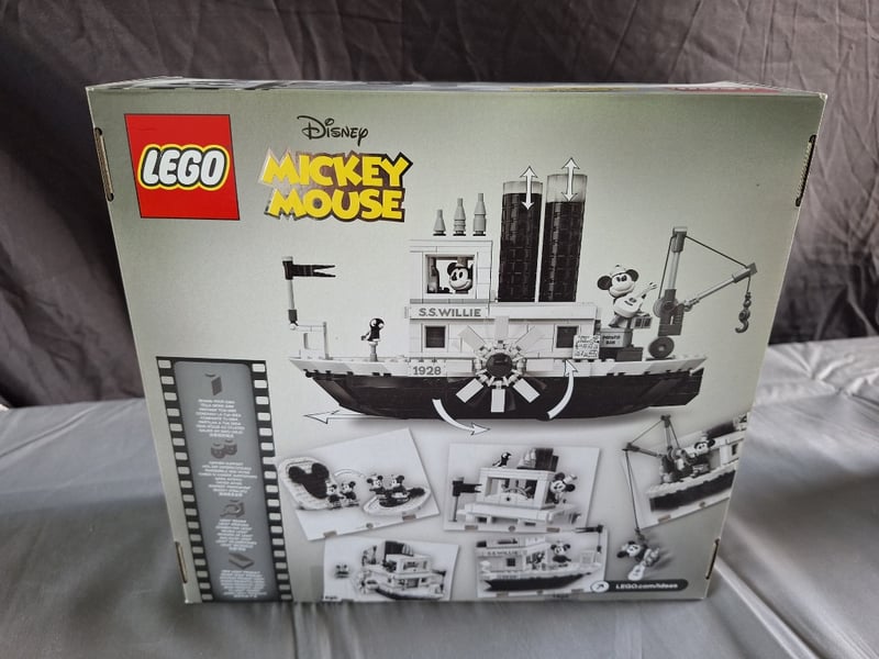 Sealed Lego Disney Steamboat Willie Set Featuring The Iconic S.S. Willie Steamboat With Mickey And Minnie Mouse Minifigures, Detailed With Smokestack, Crane, Flag, And Period-Accurate 1928 Steamboat Design.