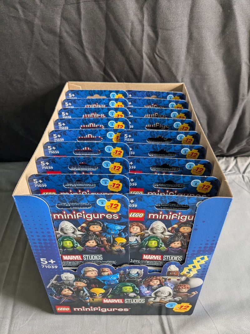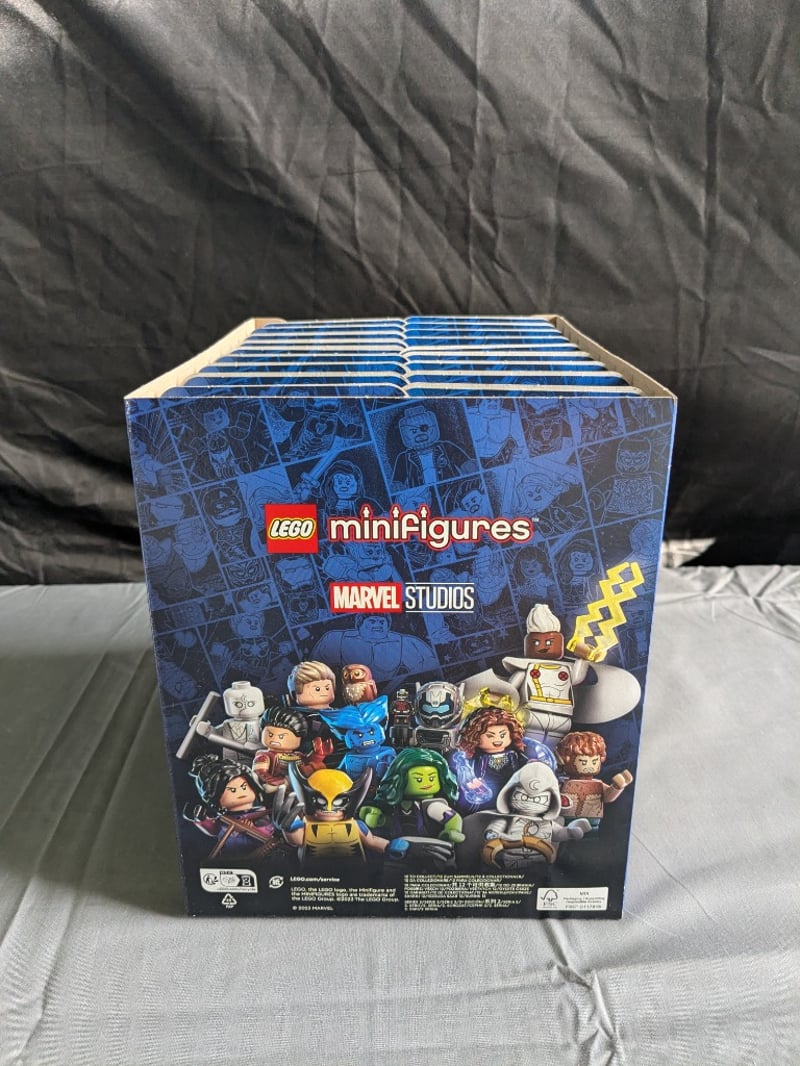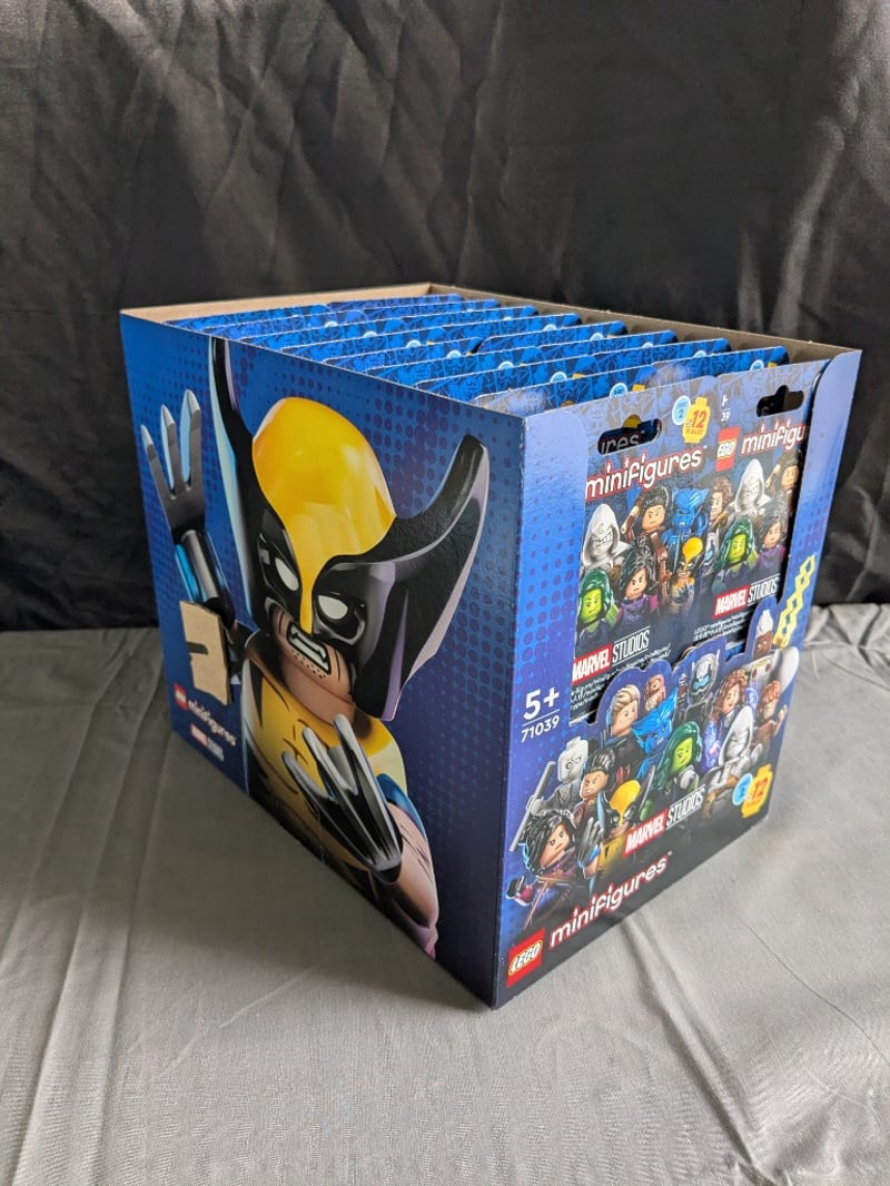 Complete Sealed Display Box Containing 36 Individual Lego Minifigures Marvel Studios Series 71039 Blind Bags (Set 71039). Box Features Iconic Marvel Character Artwork Including Wolverine On Front Panel. Includes Approximately 12 Sealed Minifigure Packets Visible In Interior View. Original Retail Packaging With Yellow "12" Promotional Stickers. Designed For Ages 5+. Collectible Minifigure Series Featuring Marvel Studios Characters.