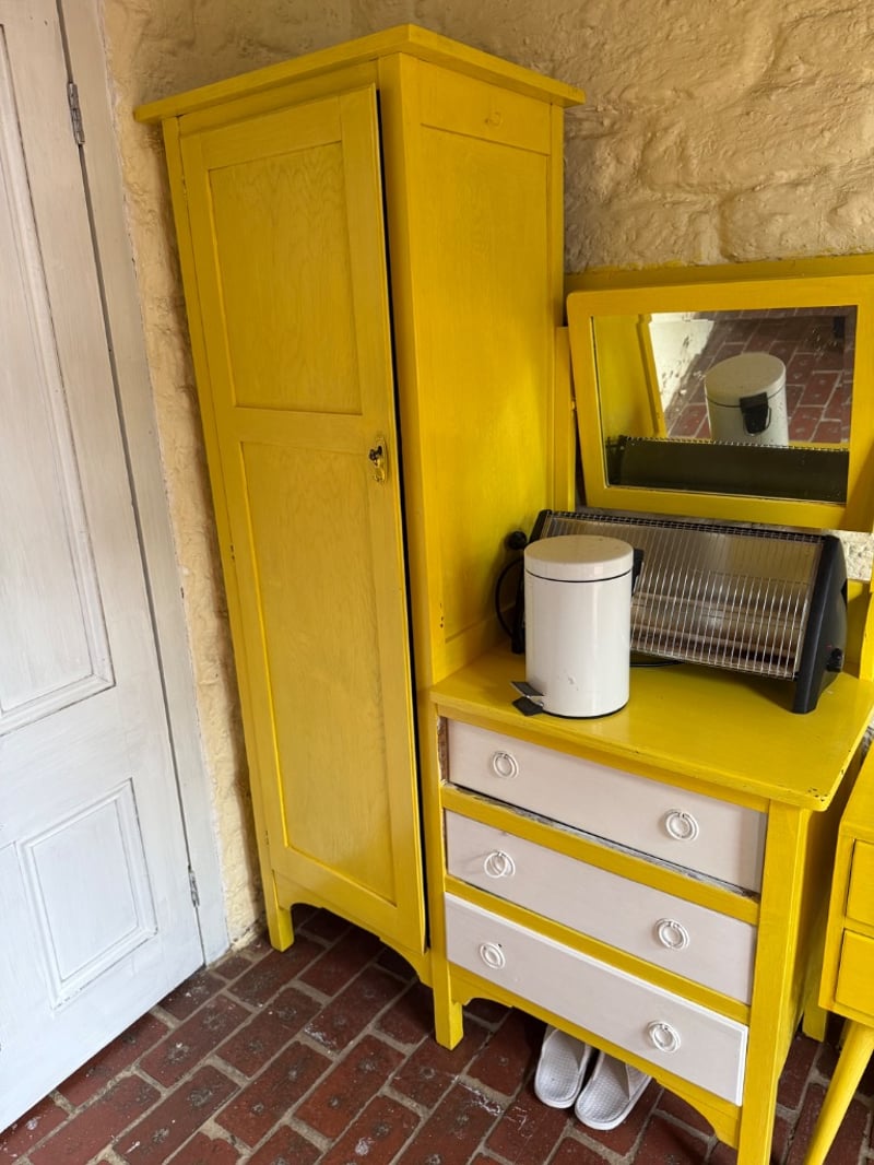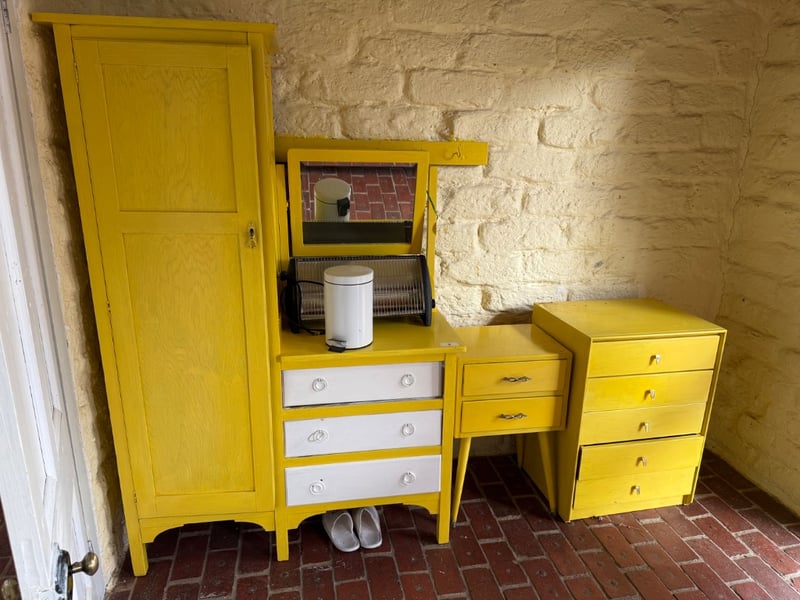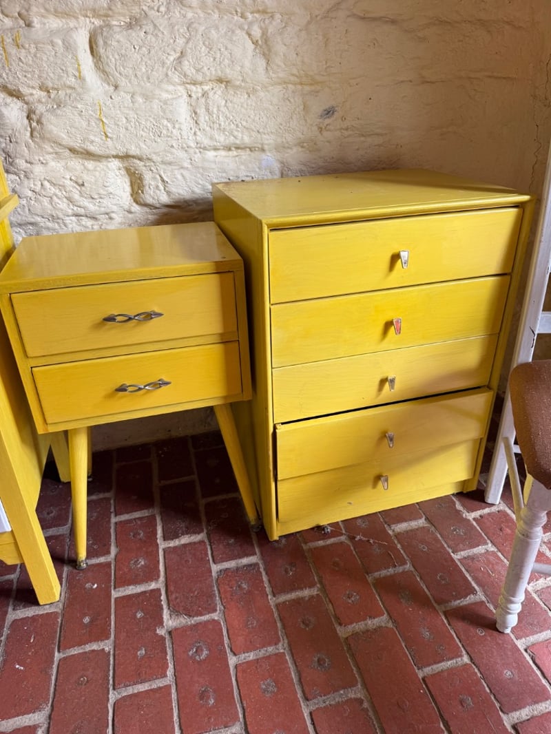 Vintage mid-century bedroom furniture set featuring striking bright yellow painted wood construction. The collection includes a tall wardrobe with single panel door, a vanity unit with mirror and integrated shelf storage, and two matching chests of drawers. The vanity features three white-fronted drawers with circular chrome handles and an upper shelf displaying a white cylindrical bin and black heater. One chest comprises two drawers with decorative metal handles, while the larger chest offers five drawers with chrome pulls. All pieces showcase clean lines characteristic of 1950s-60s design. The furniture displays original yellow finish with minor wear consistent with age. Ideal for collectors of retro furniture or those seeking authentic vintage bedroom pieces with strong aesthetic appeal.Sold as lotNote: Buyer to bring appropriate tools/ equipment to remove.