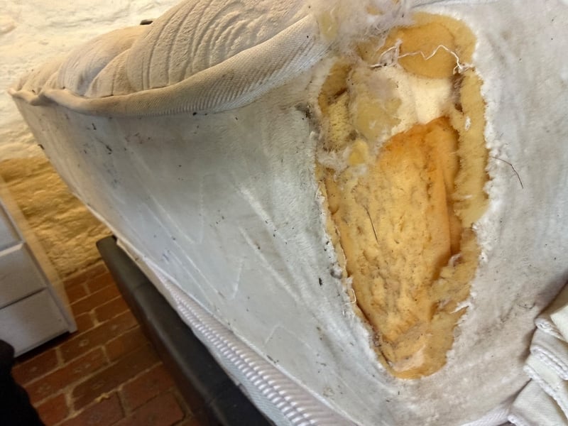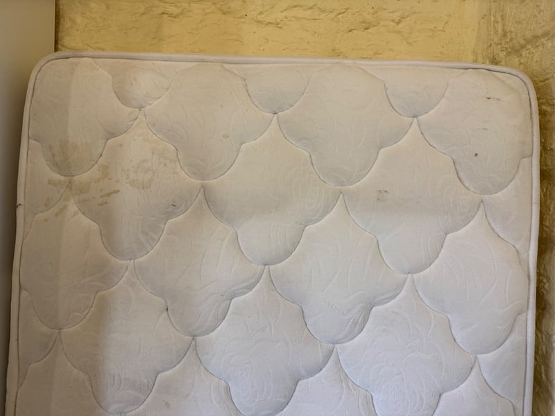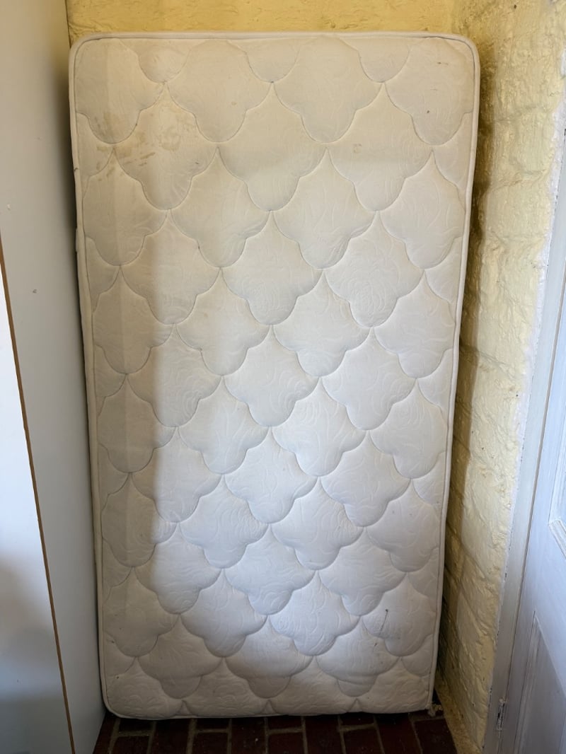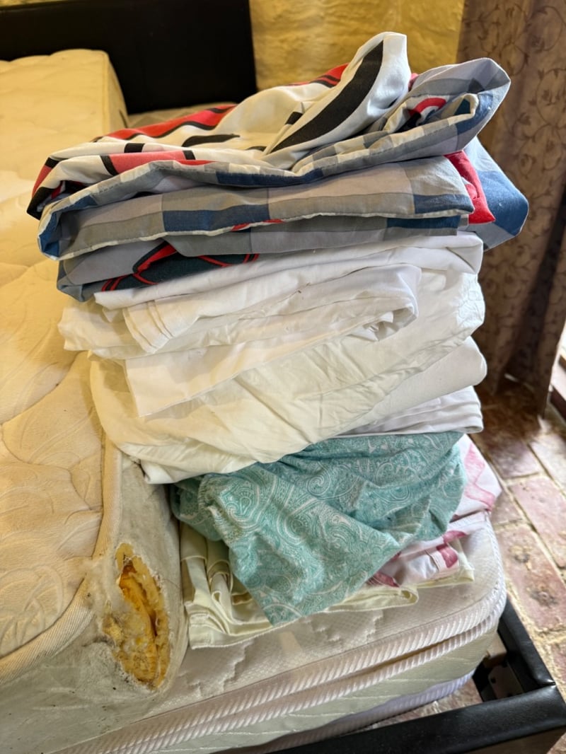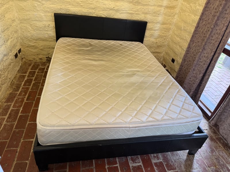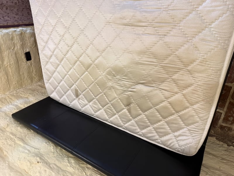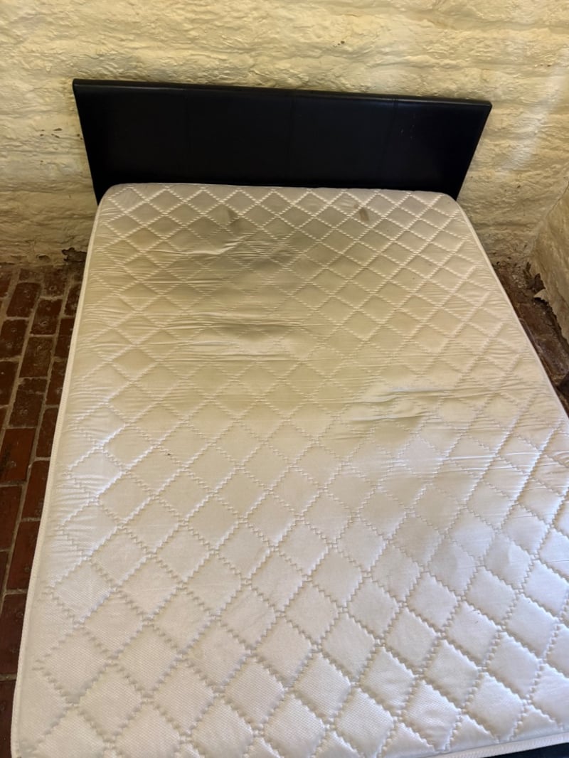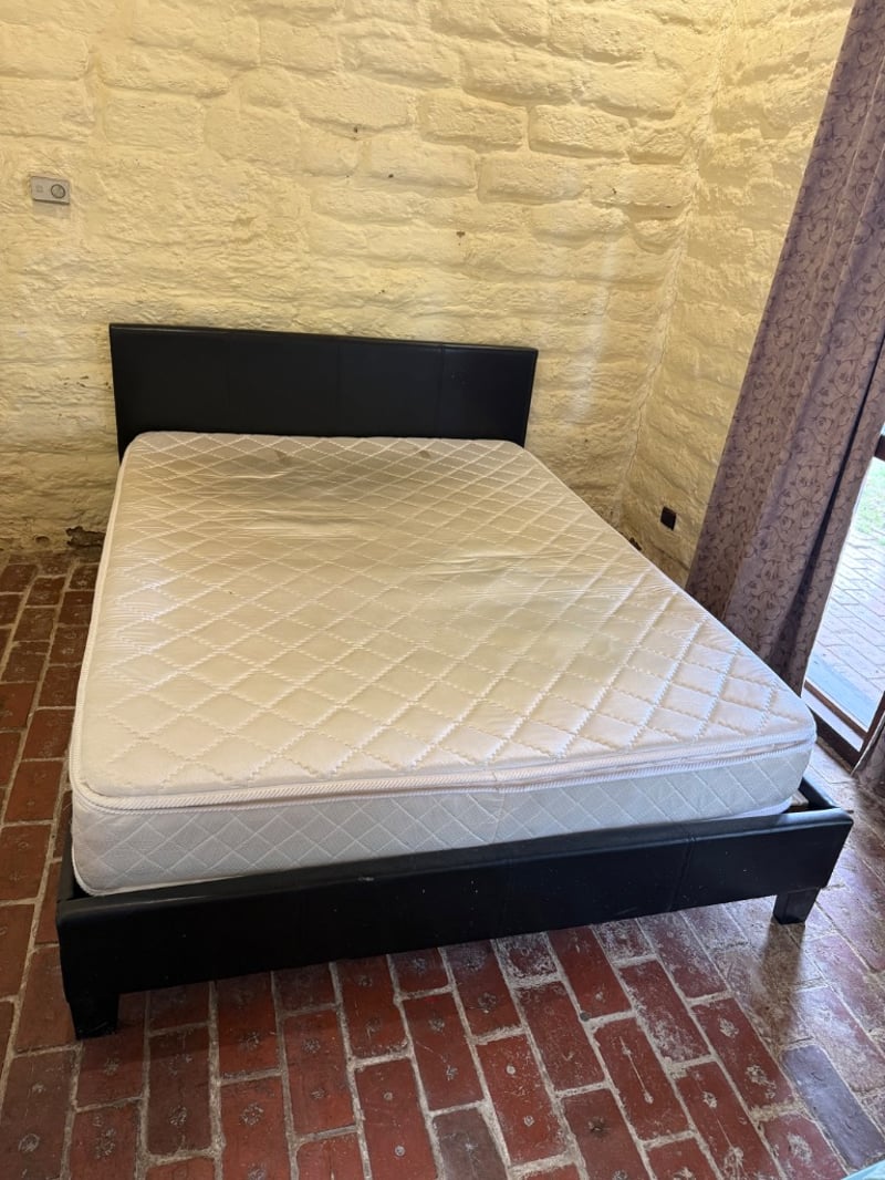 Assortment of Queen-size bed frame with mattress, a single-size mattress and beddings. Black upholstered bed frame featuring a quilted headboard. Mattress displays quilted diamond pattern surface with visible wear, staining, and deterioration. Bedding includes assorted sheets and linens in various colours (white, cream, blue, red patterned).Approx Dimensions: 91H x 250W x 161DSold as lotNote: Tear in Mattress, as seen in picturesNote: Buyer to bring appropriate tools/ equipment to remove.