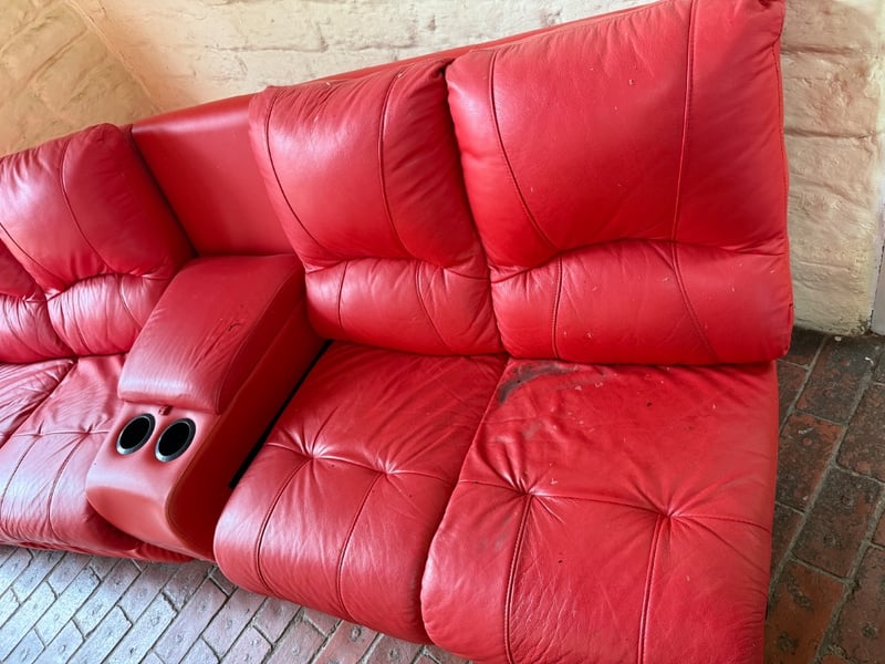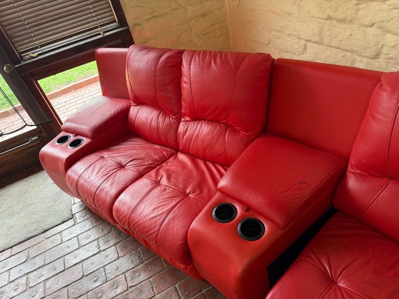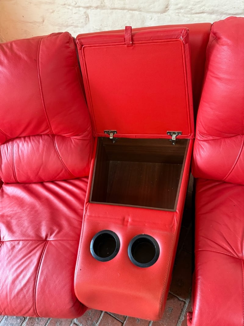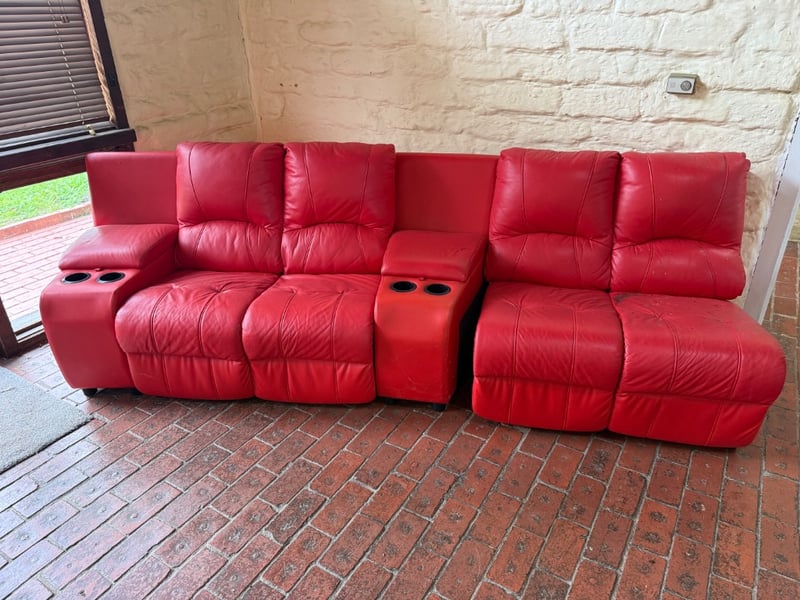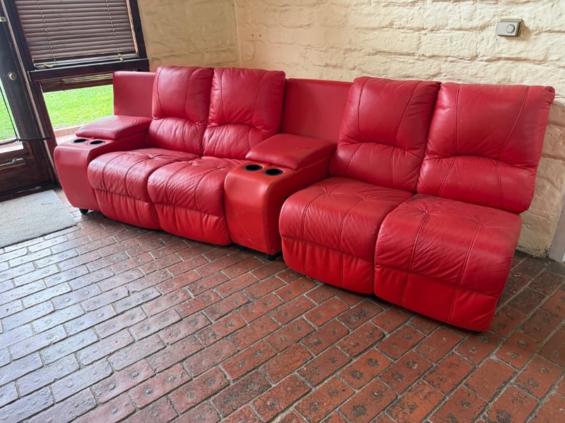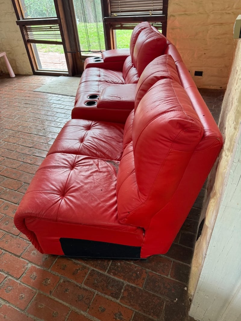 Striking red leather reclining home theatre sectional featuring modular configuration with multiple reclining seats. The suite comprises individual padded sections upholstered in genuine red leather with deep button tufting throughout. Central console features dual cup holders with storage compartment. Modular construction allows flexible arrangement to suit various room layouts. Leather shows natural patina consistent with use. Ideal for media rooms or entertainment spaces.Approx Dimensions: 92H x 305W x 86DNote: Some Marks present, refer to photos, Buyer to bring appropriate tools/ equipment to remove.