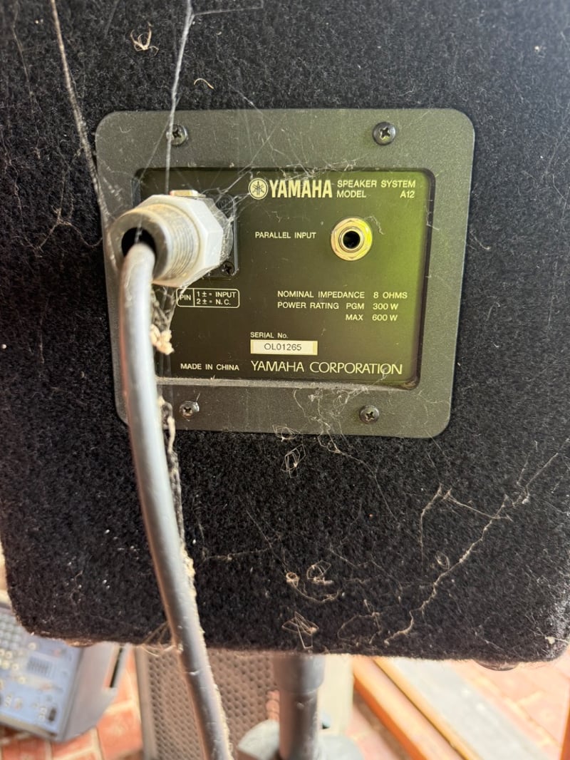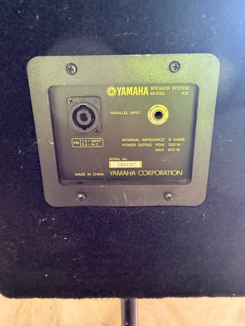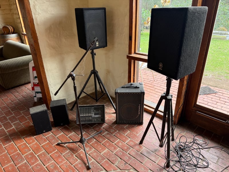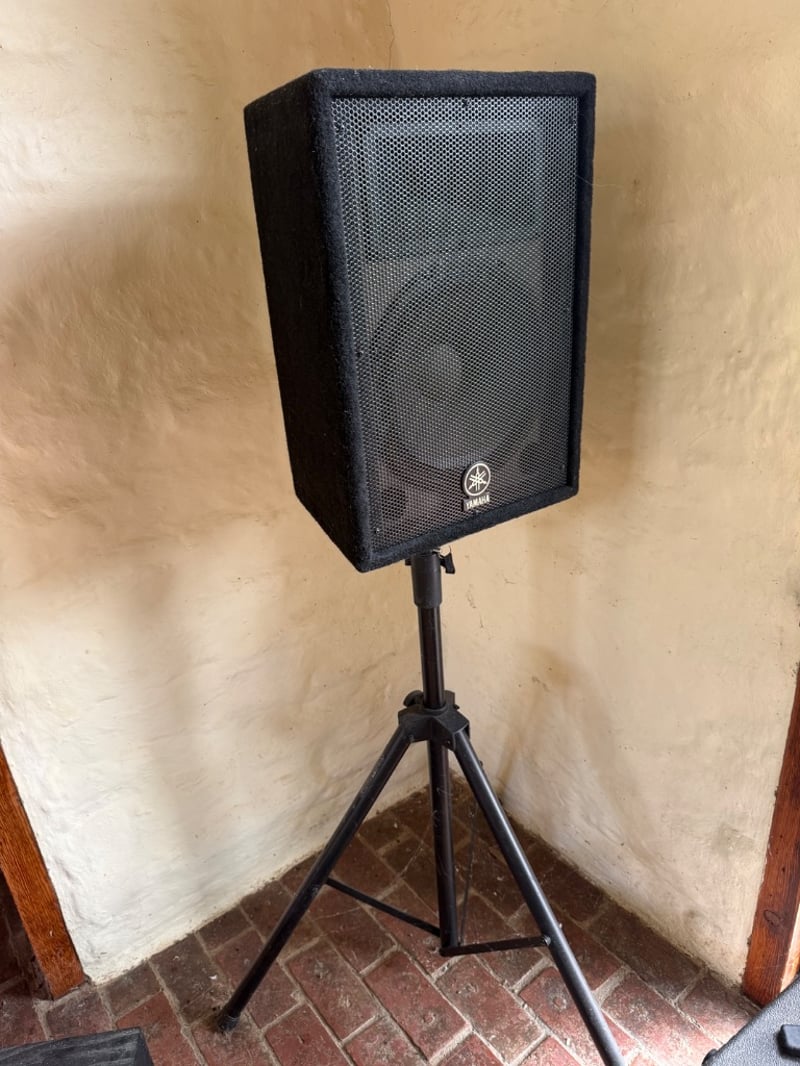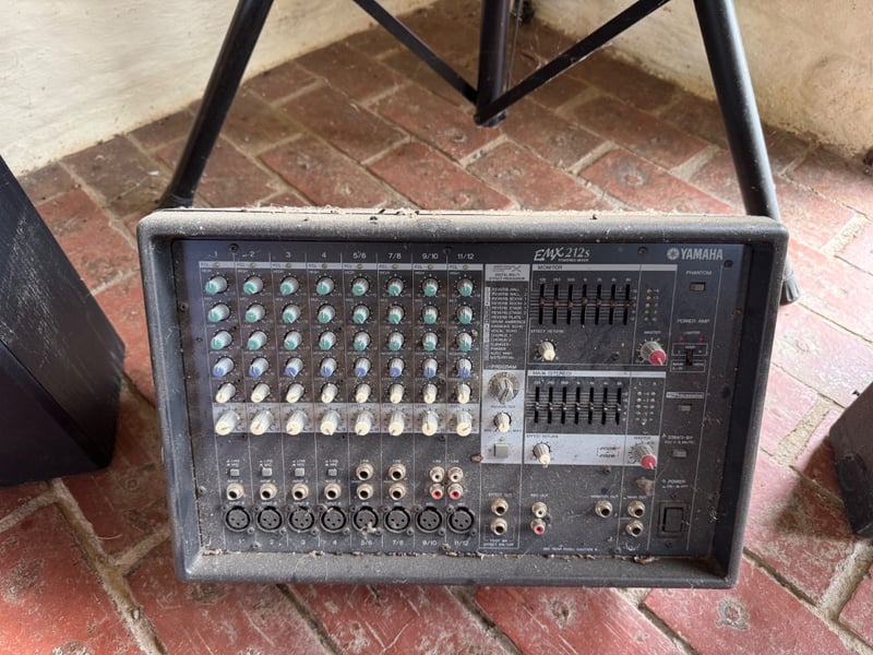 Comprehensive professional audio system comprising Yamaha EMX212S powered mixer (8-channel, 2x300W output), Yamaha DBR12 active speaker (12" woofer, 600W max), Yamaha A12 passive speakers (8 ohms, 300W-600W rated), 2 Wharfedale Delta 30.2 passive speaker (8 ohms, 100W rated), additional compact passive monitors, professional microphone stand, speaker stands with tripod bases, extensive XLR and audio cabling. This lot also includes 5 Pioneer wall speakers. Equipment shows age-appropriate wear consistent with regular use in professional settings. Untested, sold as is. Sold as lot