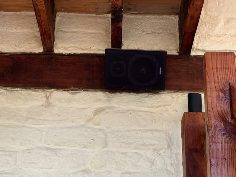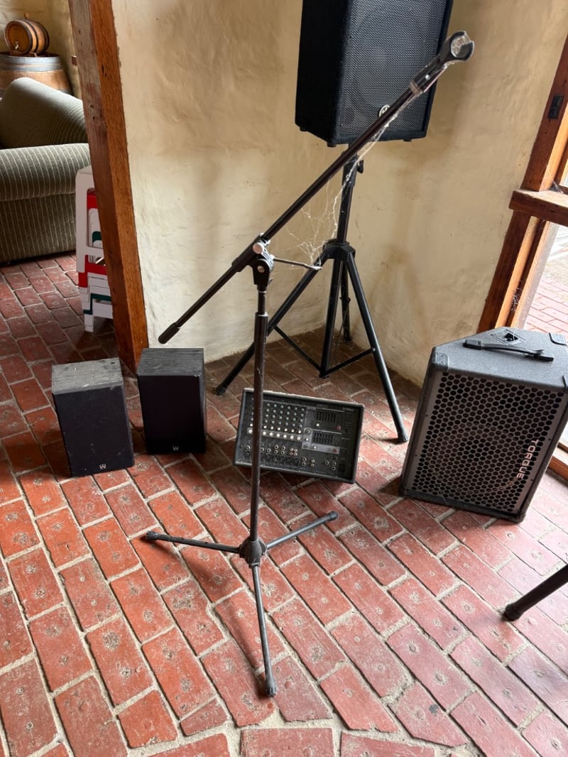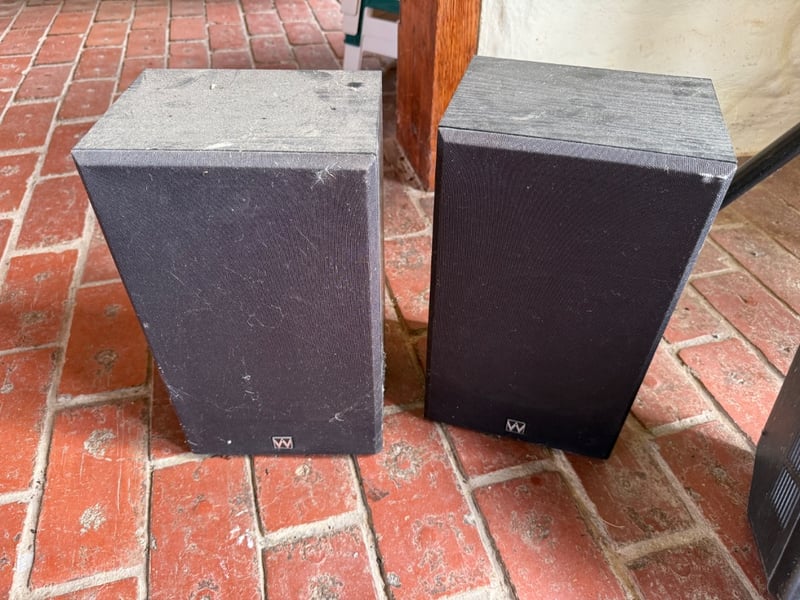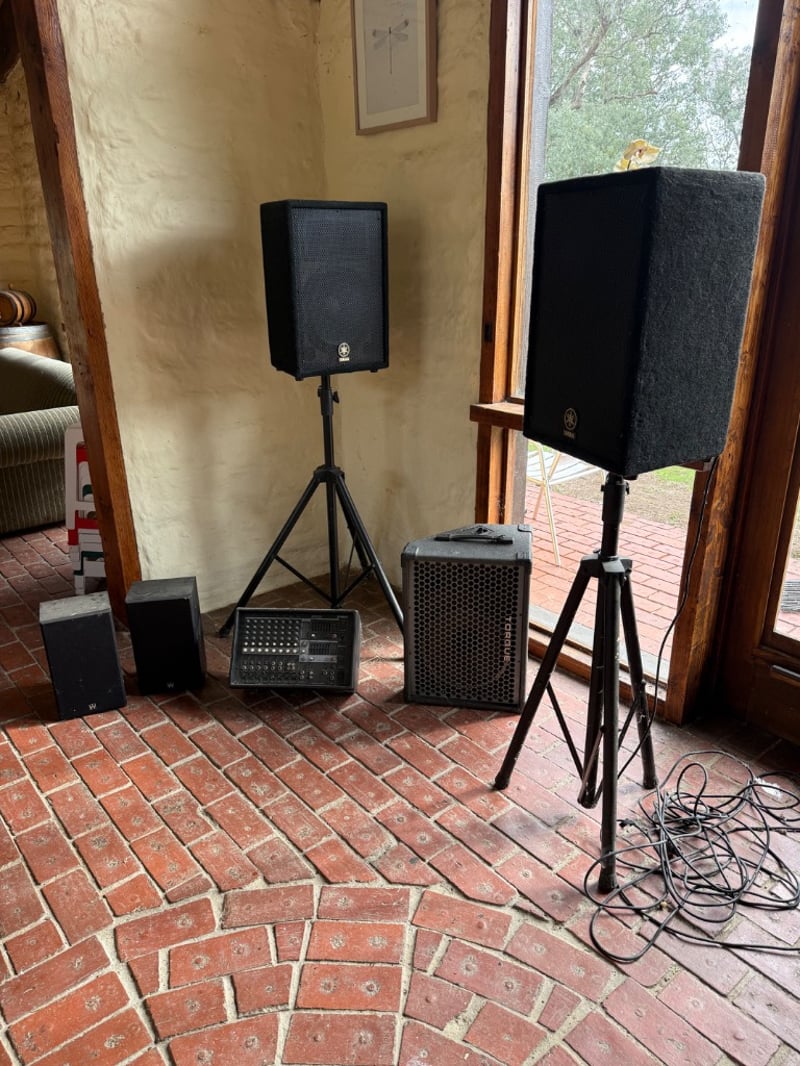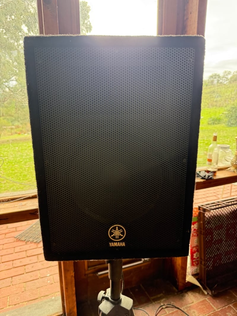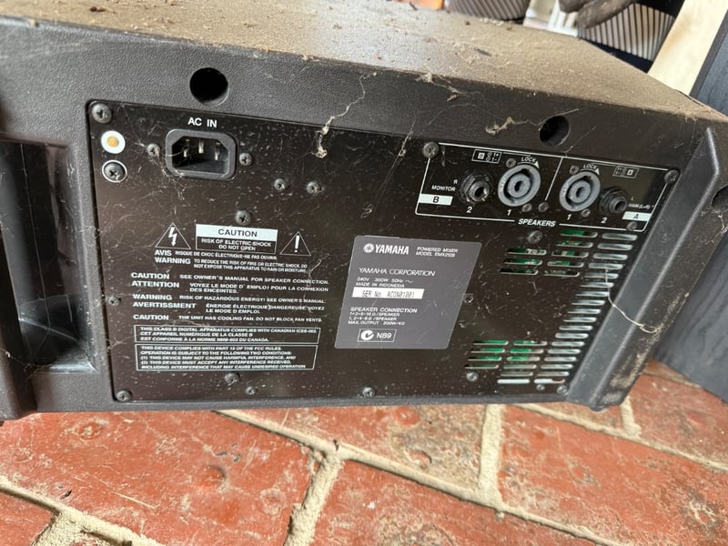 Comprehensive professional audio system comprising Yamaha EMX212S powered mixer (8-channel, 2x300W output), Yamaha DBR12 active speaker (12" woofer, 600W max), Yamaha A12 passive speakers (8 ohms, 300W-600W rated), 2 Wharfedale Delta 30.2 passive speaker (8 ohms, 100W rated), additional compact passive monitors, professional microphone stand, speaker stands with tripod bases, extensive XLR and audio cabling. This lot also includes 5 Pioneer wall speakers. Equipment shows age-appropriate wear consistent with regular use in professional settings. Untested, sold as is. Sold as lot
