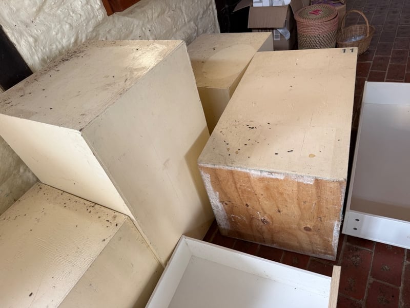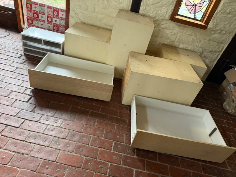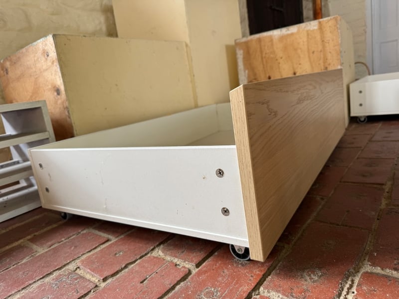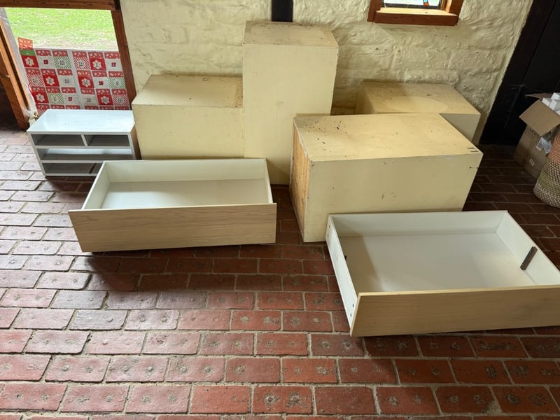Comprehensive lot of storage solutions. Includes multiple white and natural timber underbed storage units and large storage boxes. Several items feature pull-out drawer mechanisms on wheeled bases suitable for under-bed or modular storage applications. Ideal for bedroom organisation, retail display, or craft storage. Sold as lotNote: Buyer to bring appropriate tools/ equipment to remove.