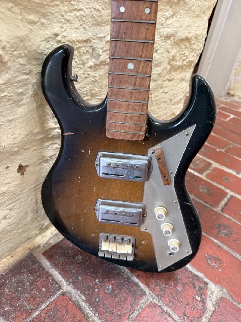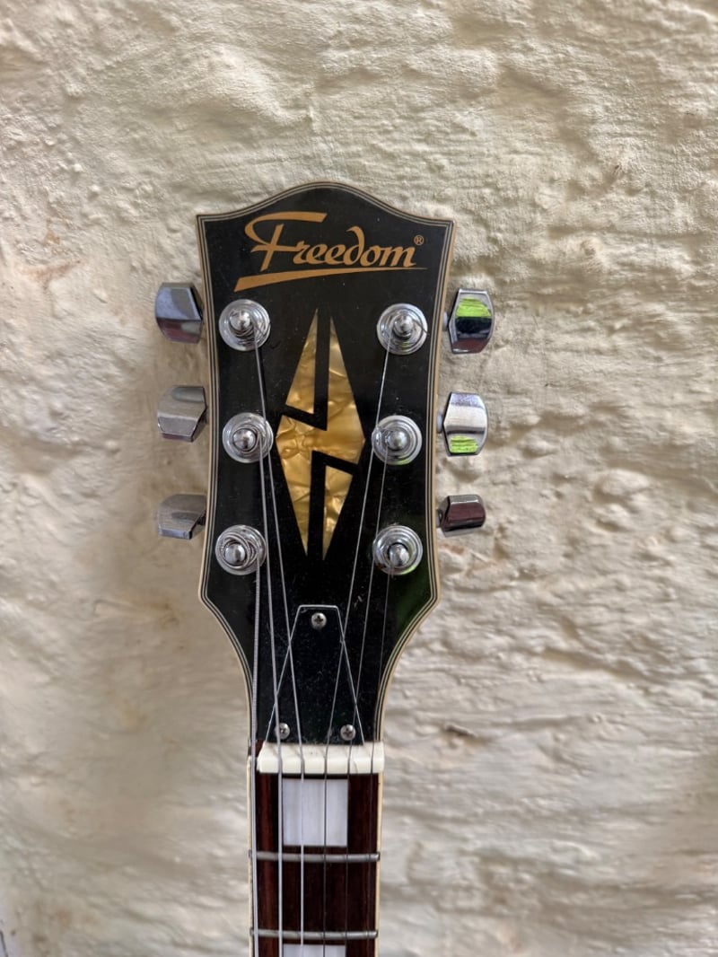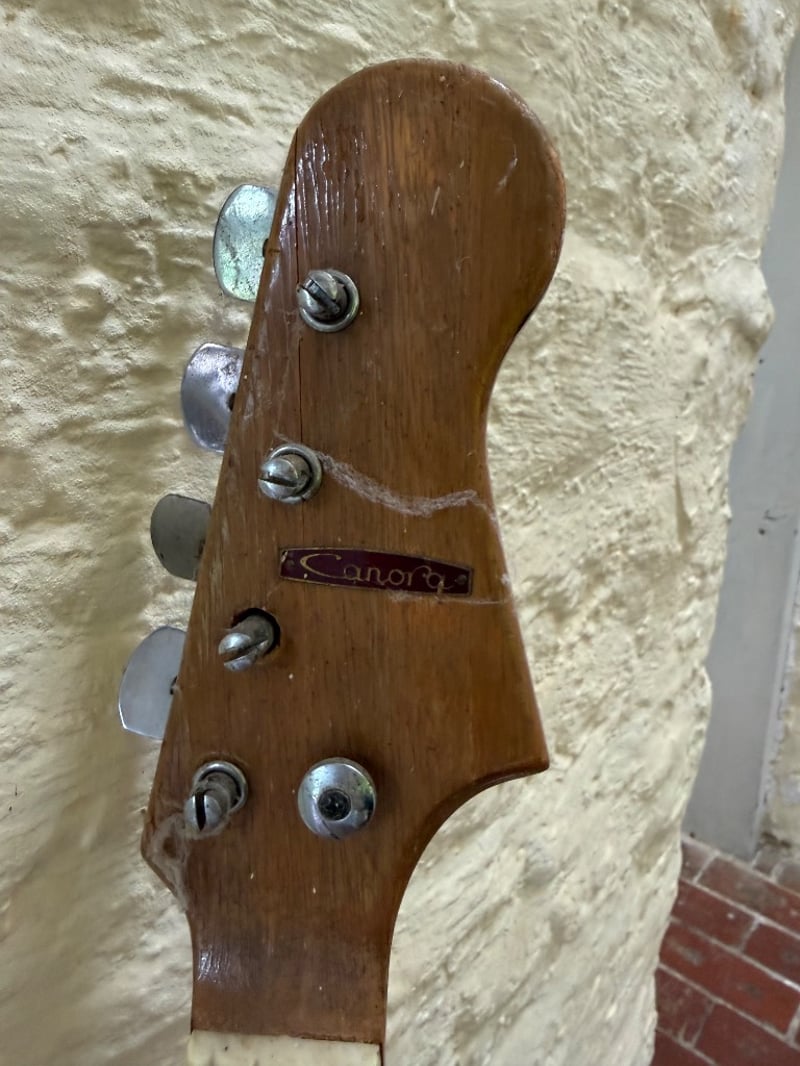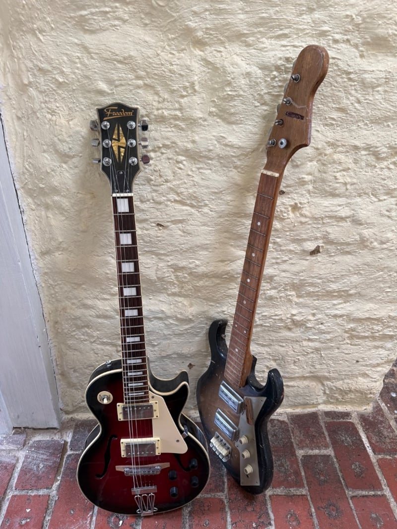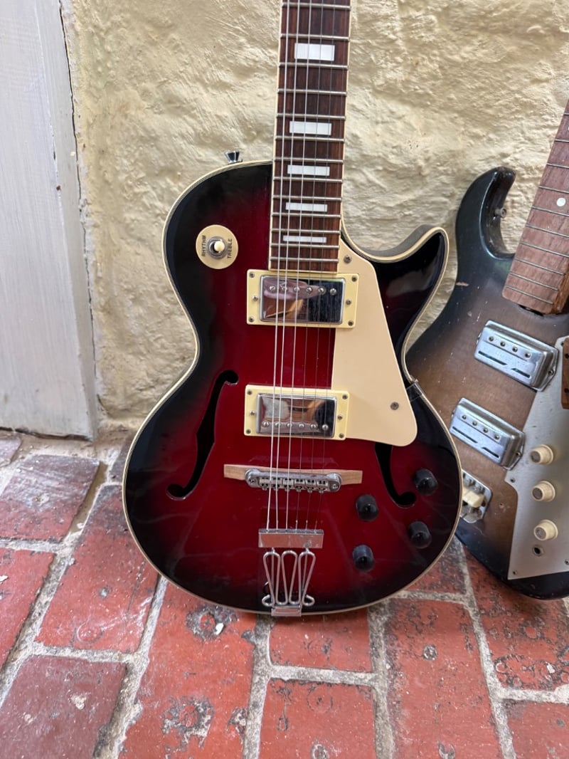 Vintage guitar collection featuring two semi-hollow body electric guitars. The primary instrument is a Freedom brand semi-hollow body electric guitar with a striking dark red and black sunburst finish, cream-coloured pickguard, and dual cream-coloured humbucker pickups. The headstock displays the Freedom logo with gold inlay detailing. The neck features a rosewood fretboard with white block inlays and a bound headstock. The second guitar is a Canora brand solid body electric bass guitar with a natural wood finish, sunburst effect, and dual single-coil pickups with chrome hardware. Both instruments feature quality construction with bound bodies and professional hardware. The Freedom guitar exhibits a semi-hollow body design with f-holes, while the Canora bass features a solid body Stratocaster-style design. Both instruments show signs of age and use consistent with vintage equipment, including minor finish wear and patina. Ideal for collectors or musicians seeking authentic vintage electric instruments with character and playability.Sold as lot