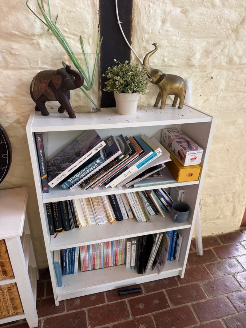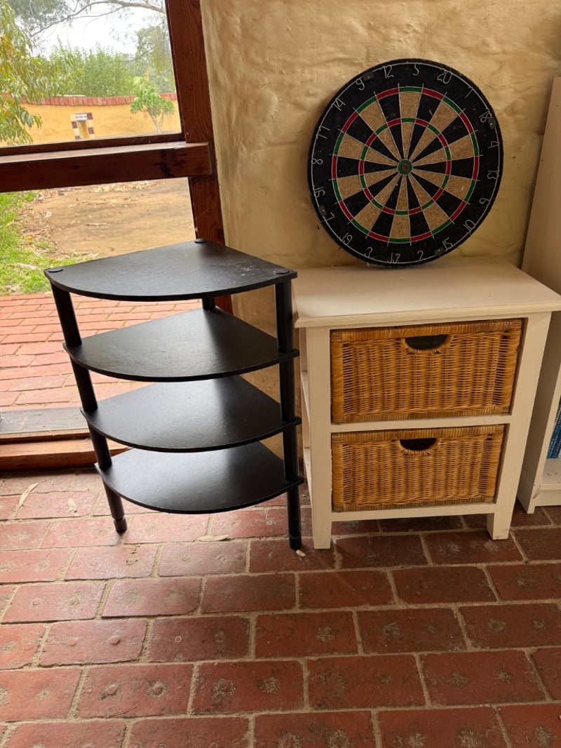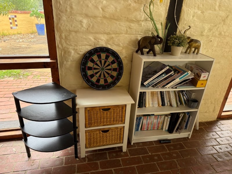 Curated collection of home furnishings and entertainment items featuring a black curved three-tier side table with metal frame and rounded shelving, a cream-coloured storage unit with wicker basket drawers, a white bookshelf with four shelves displaying an extensive collection of books, a dartboard, elephant figurines, a potted succulent plant, and various decorative accessories. The ensemble reflects a blend of functional storage solutions and leisure entertainment pieces suitable for living spaces or recreational areas. Sold as lot